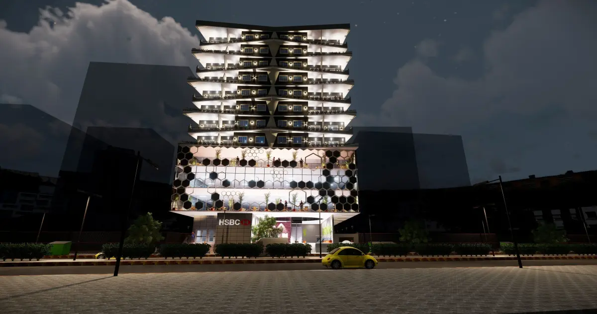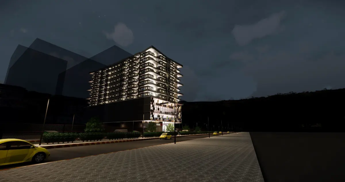 12 stories high 8 residential1 administrative3 commercialEXTERIOR onlythe building overlooks one main street, two neighbors and an ally modern styleRevit 2019lumionenscape