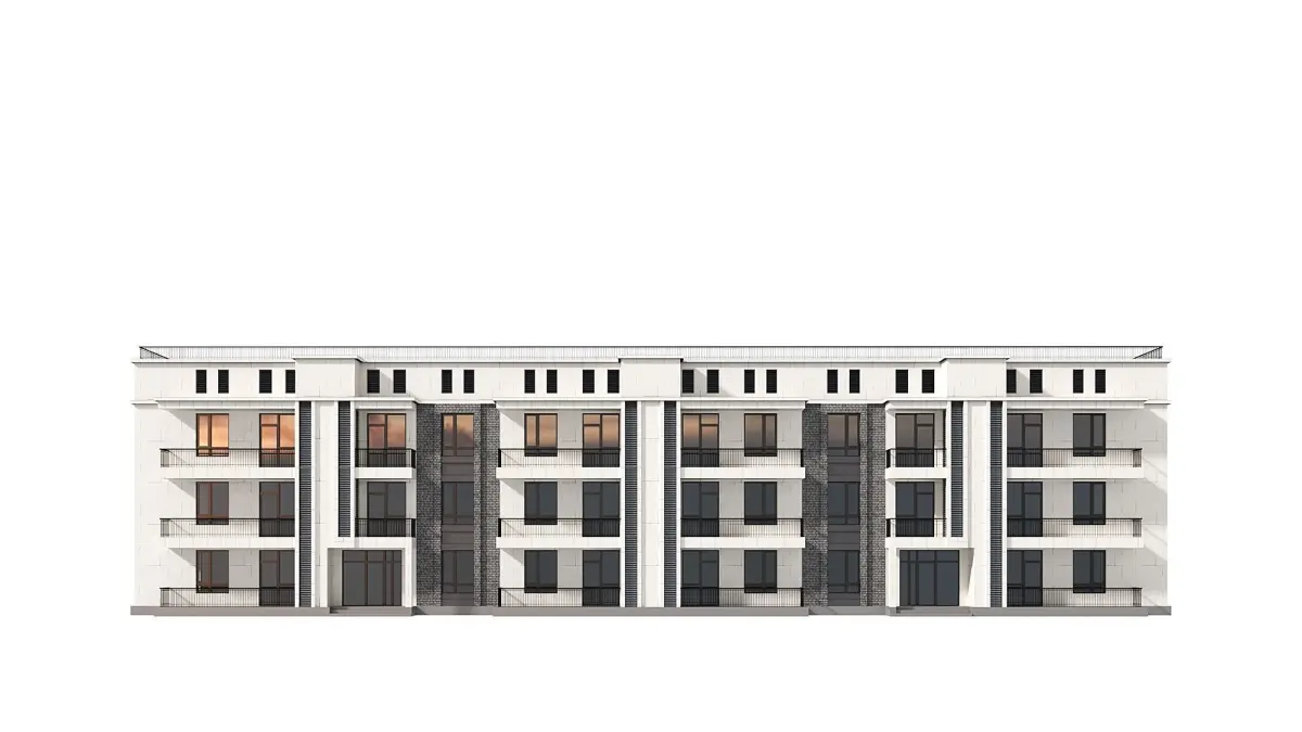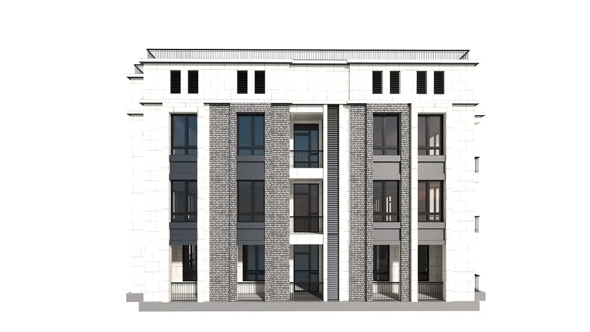 This 3D model is a three-storey residential building made of white granite blocks, which is an example of modern architecture that combines strength, reliability and aesthetic appeal.