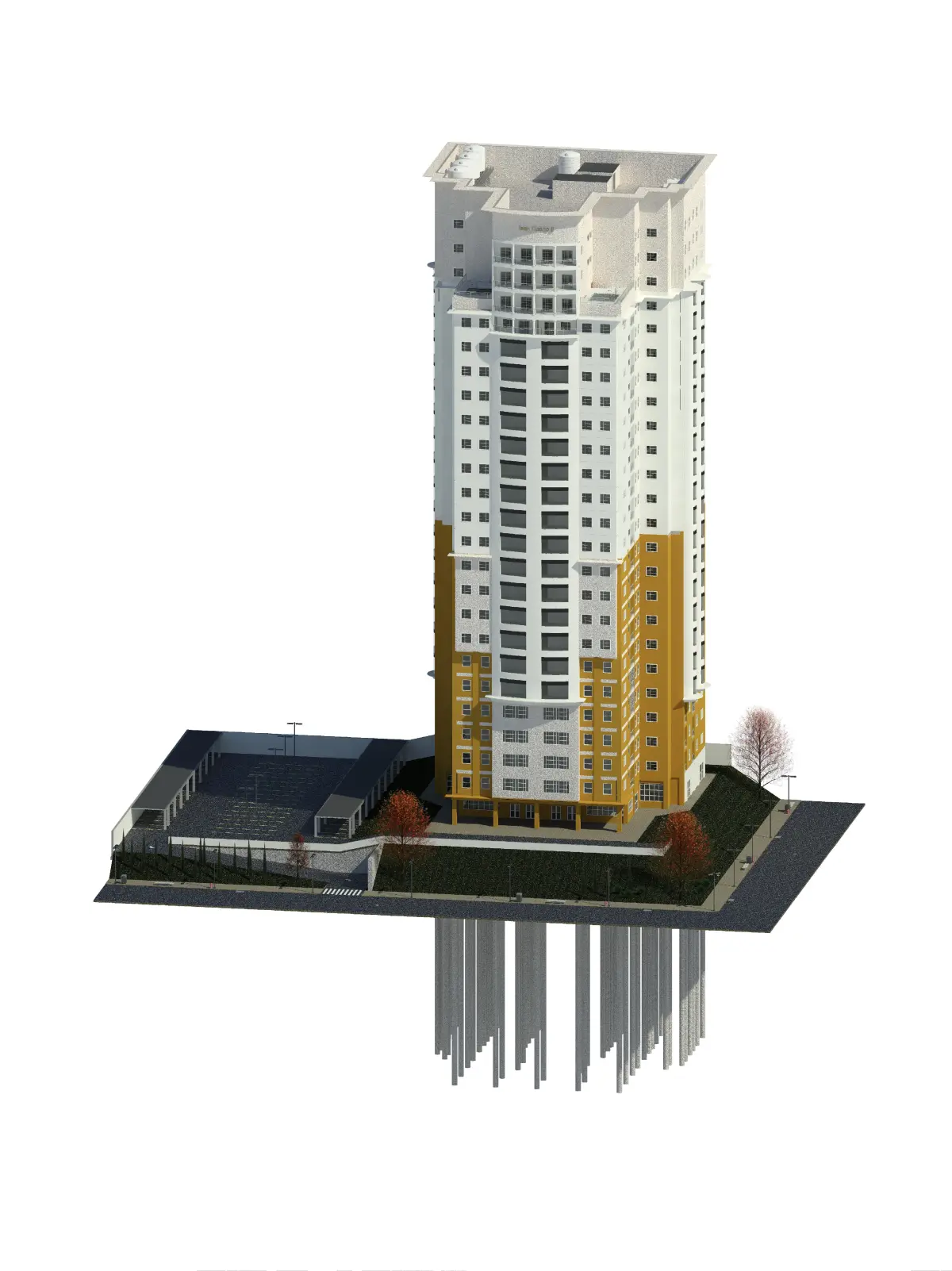 - Building with concrete structure and foundation by piles.