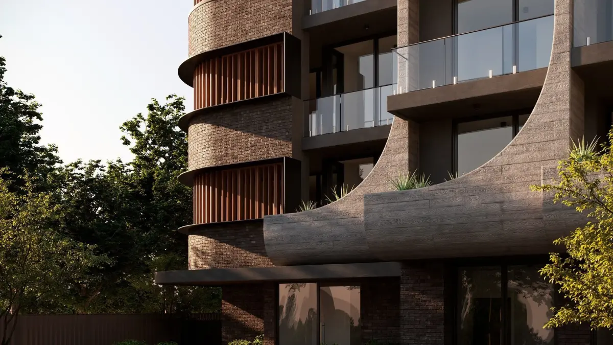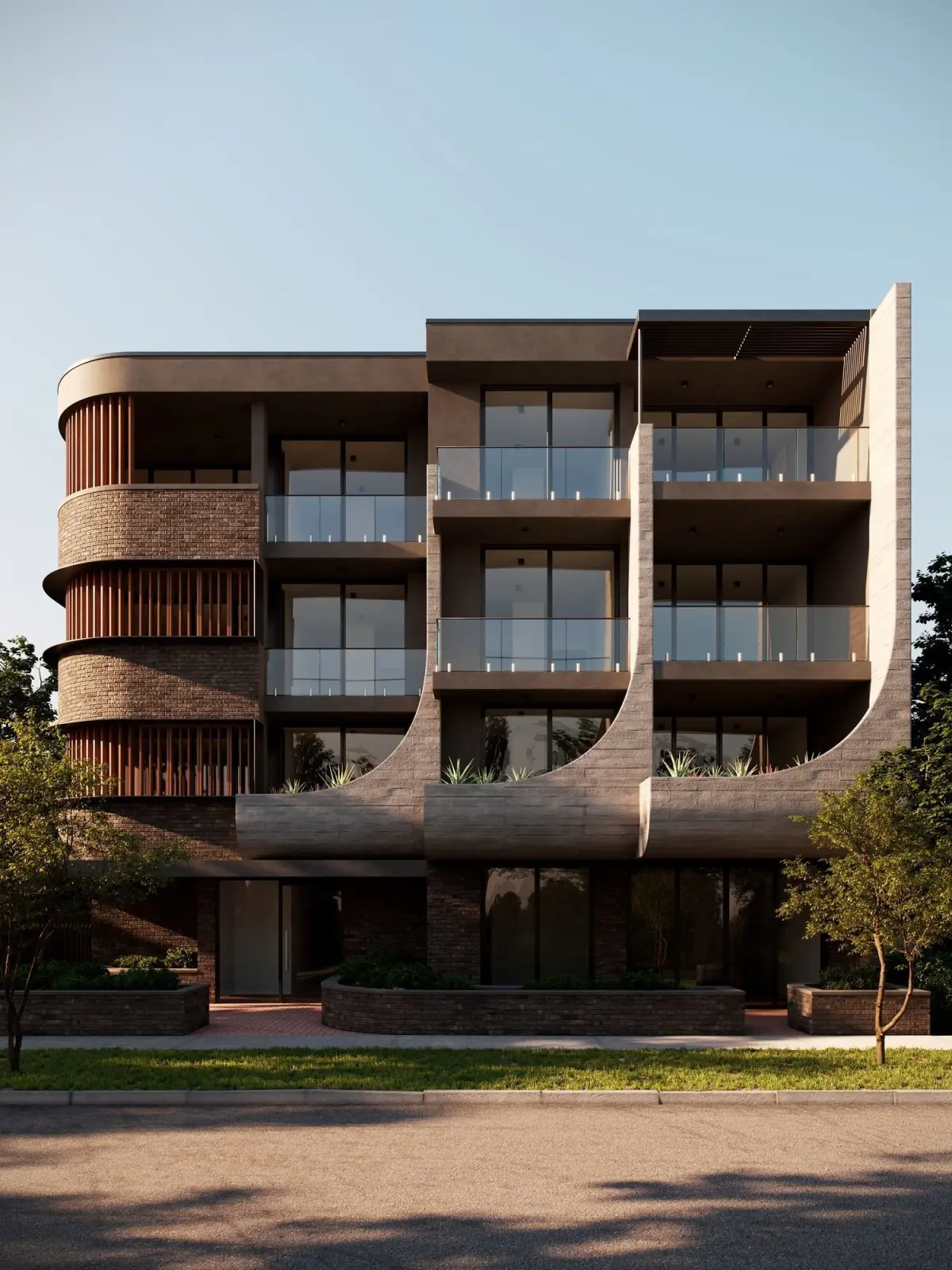 This 3D project showcases a modern residential building with a unique architectural design that combines smooth curves and strict geometry. The facade is made of concrete, brick, and glass, creating an elegant and sophisticated look.