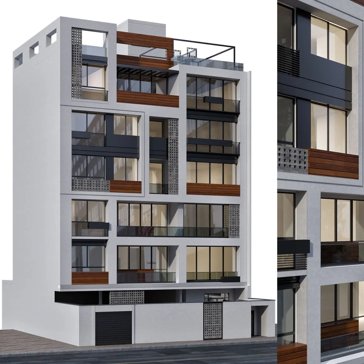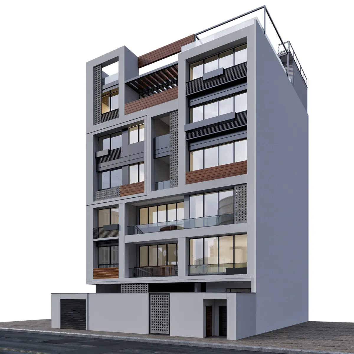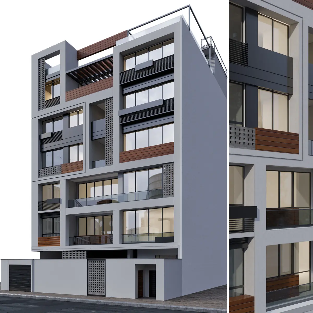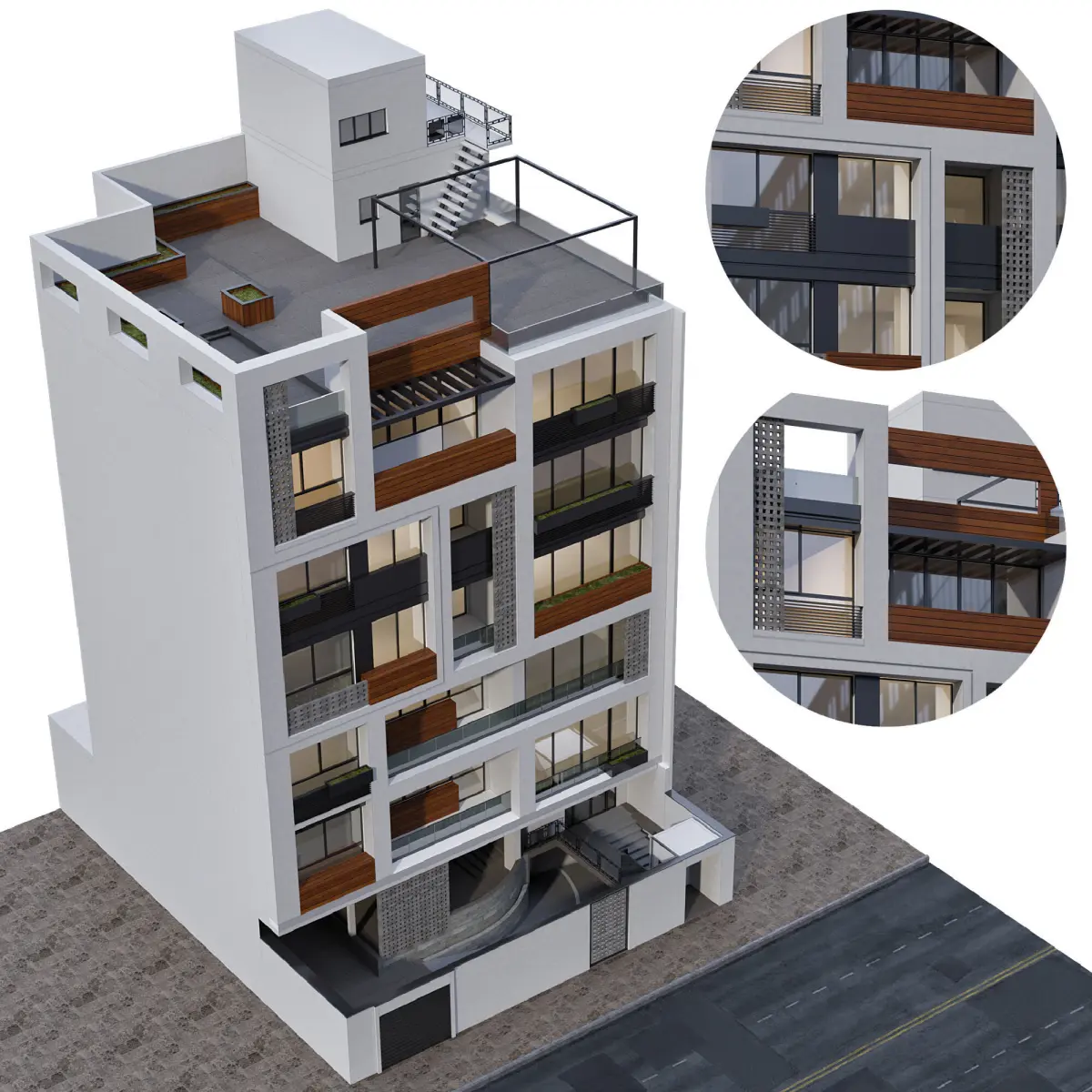 the building includes parking space,terraces,entrance gate and lots of details