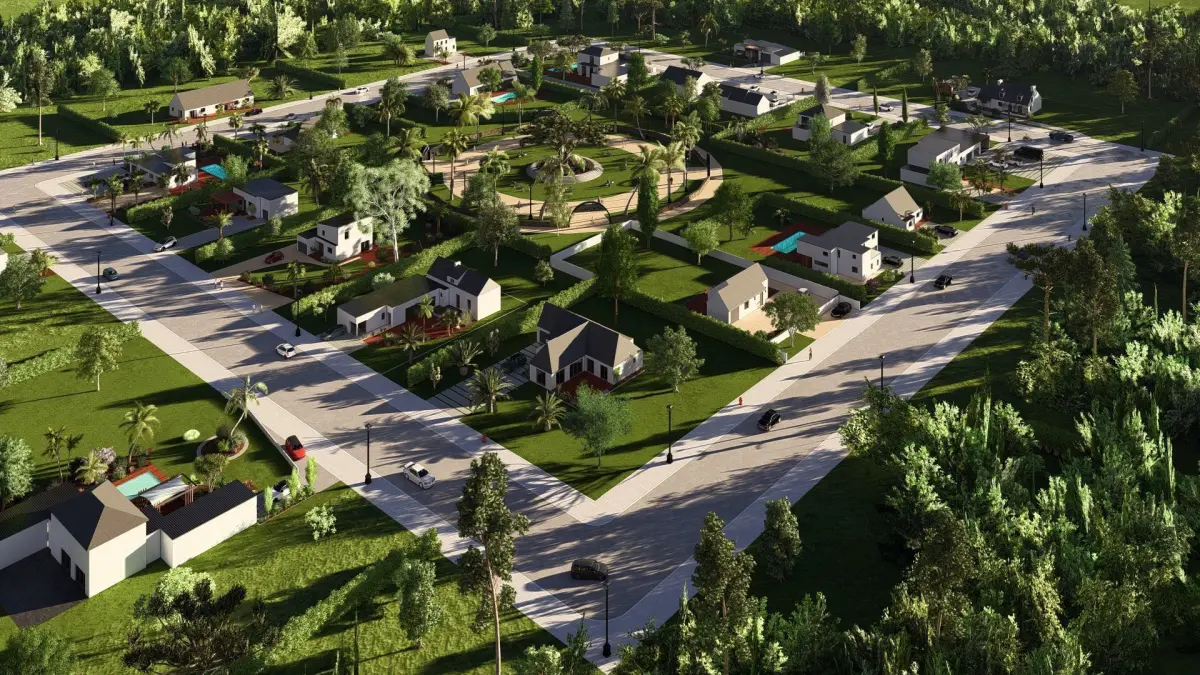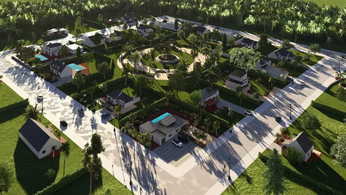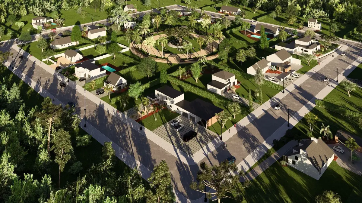 Full SketchUp 3D modelLumion-ready with complete vegetation and graphics20 detailed modern housesSpacious central parkSecure gated community layoutClean topology and optimized geometry
