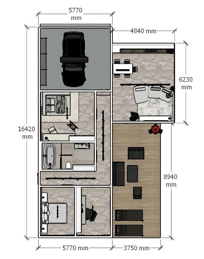 Photo: Overall floor plan showcasing the open-plan living area, functional spaces, and outdoor terrace, perfect for relaxation and entertaining guests.
