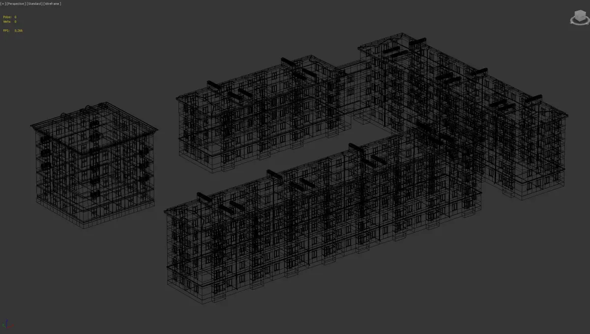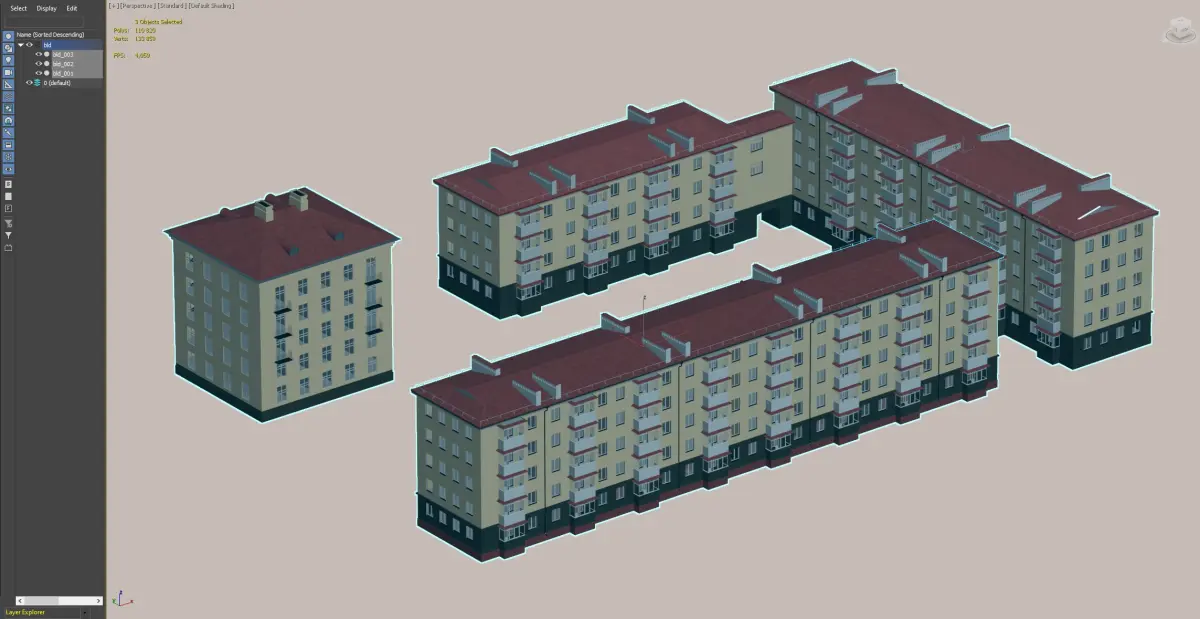 A detailed model of Soviet-era residential apartment buildings with red roofs and balconies. Perfect for urban visualization and historical architectural projects.