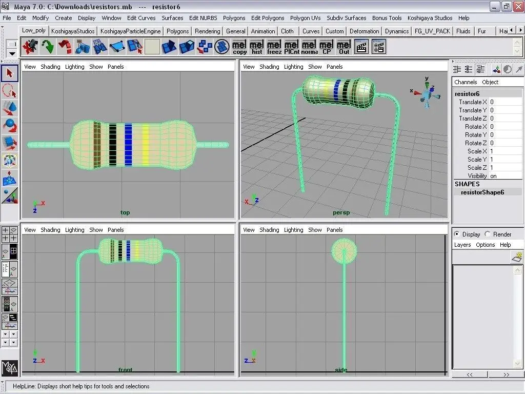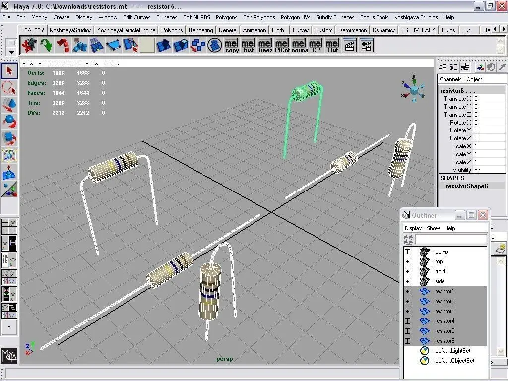 Six low poly resistor models (two tipes in three positions).Made with Maya 7, clean topology, no N-gons and triangles, quads only.UV mapped and fully textured, unwrapping done with overlapping.Maya 7 (.ma, .mb), OBJ (.obj with .mtl), 3ds Max 2009 (.max) and Autodesk FBX (.fbx) format included. FBX and OBJ are directly exported from Maya.Scene total:Polygons: 1644 (150-400 each resistor)Vertices: 1668Every model is mapped on single 256×256 pixels texture map. Original working .psd texture with layers for easy editing and 8 .bmp textures with different ohm values are included in textures_resistor.zip file.