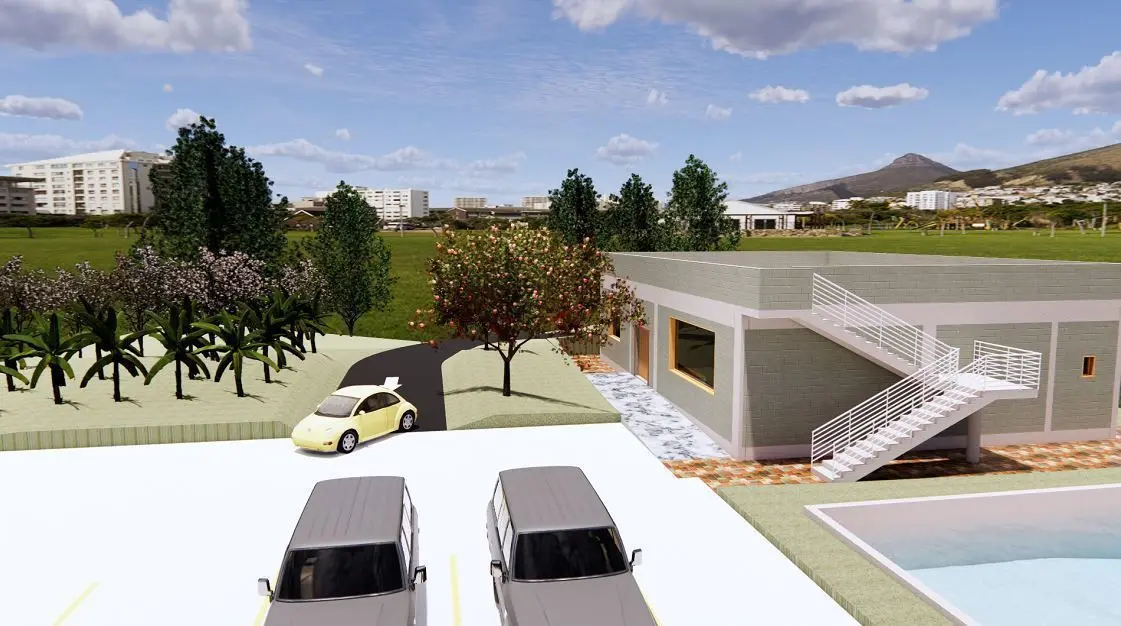 one story Resort house with swimming pool and garden and parking along with the internal furnituresliving room, dining, kitchen and bathroom.
