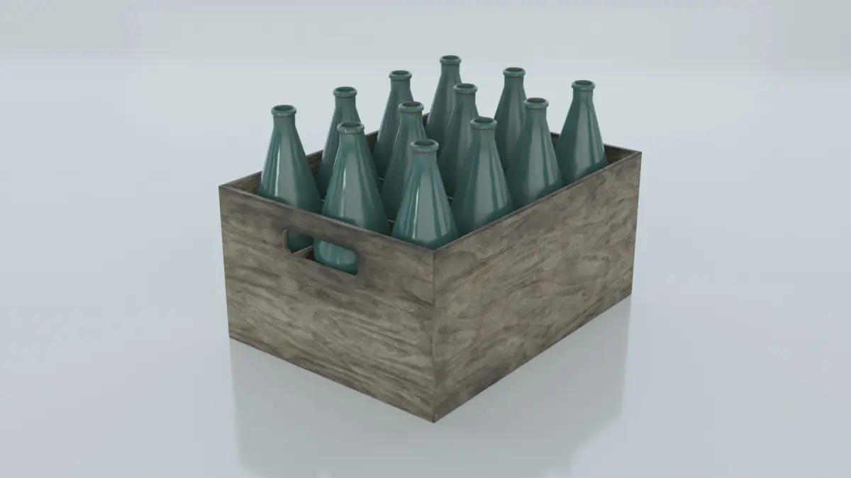 Low Poly Models of bottles, a bottle crate and raw glas, meant to be used in a factory builder game.Vertice count:
