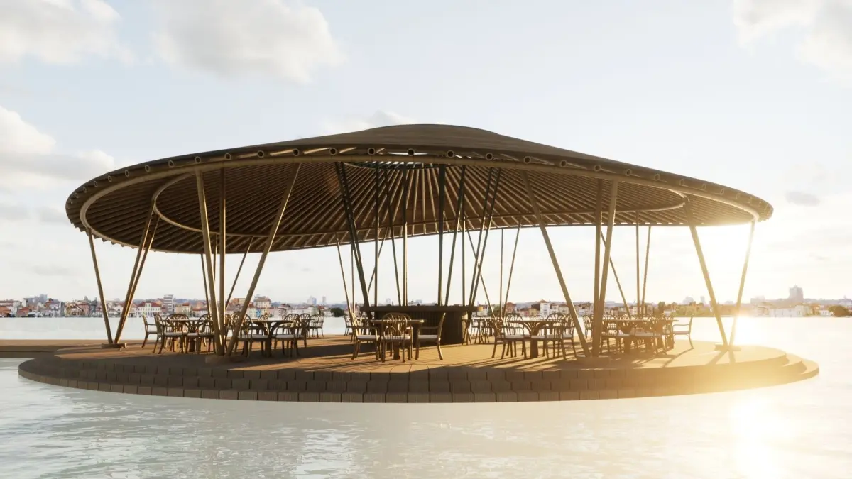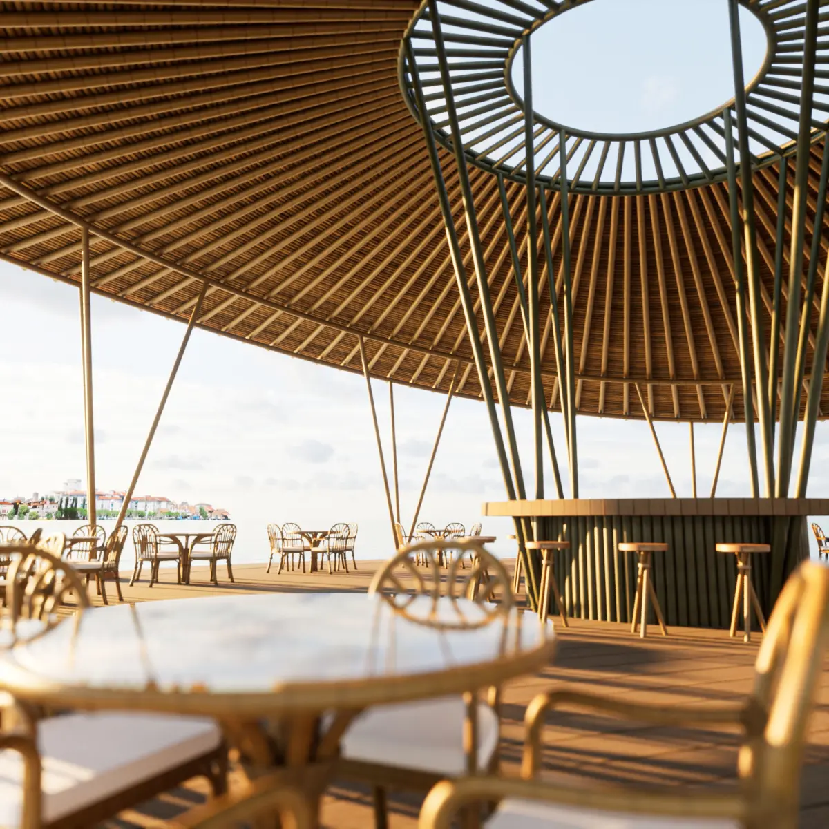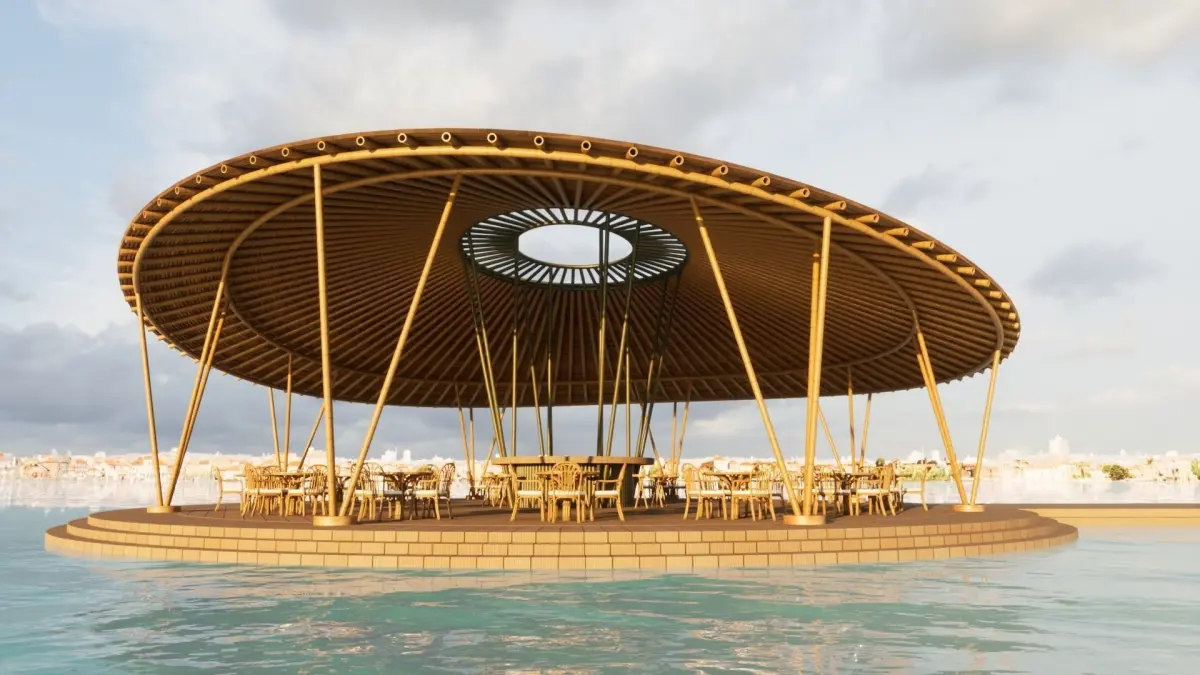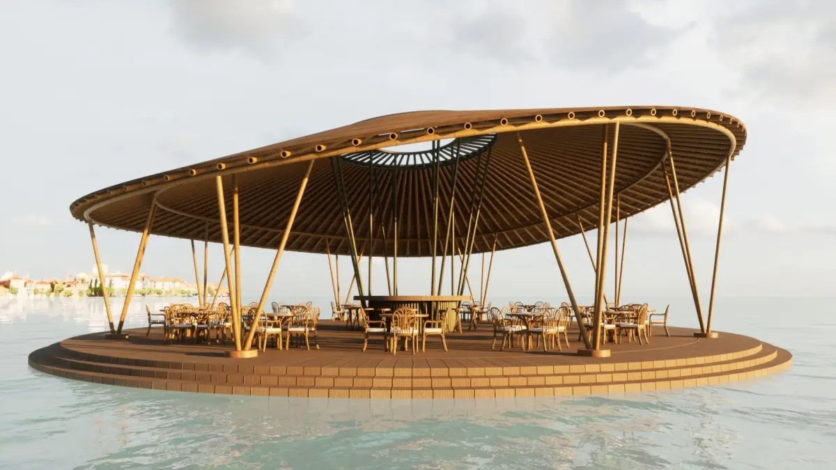 - Restaurant design concept with bamboo umbrella ceiling in the middle of the sea.