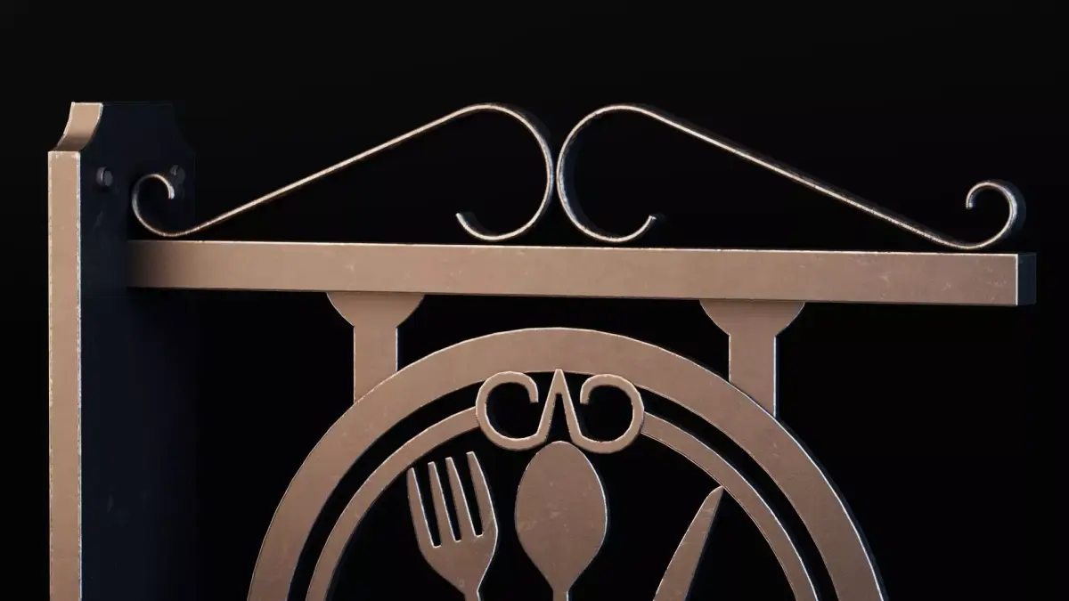 The worn metallic texture adds an aged, realistic look, suitable for vintage or modern restaurant environments. Every detail, from the bolt fixtures to the engraved letters and ornamental frame, is carefully modeled to ensure maximum realism.