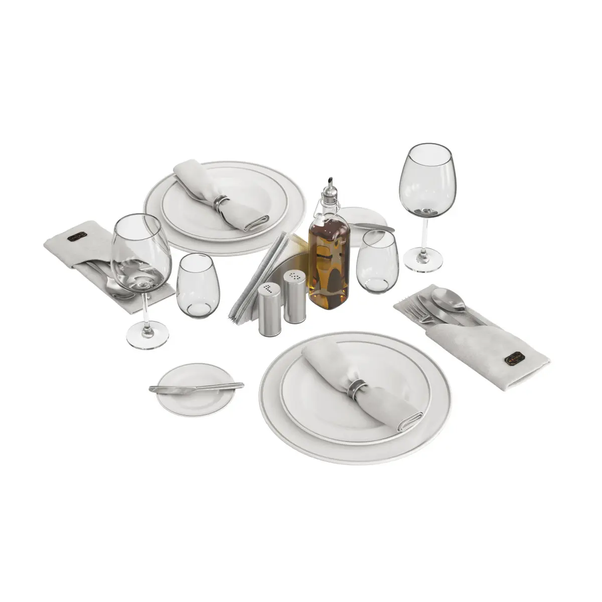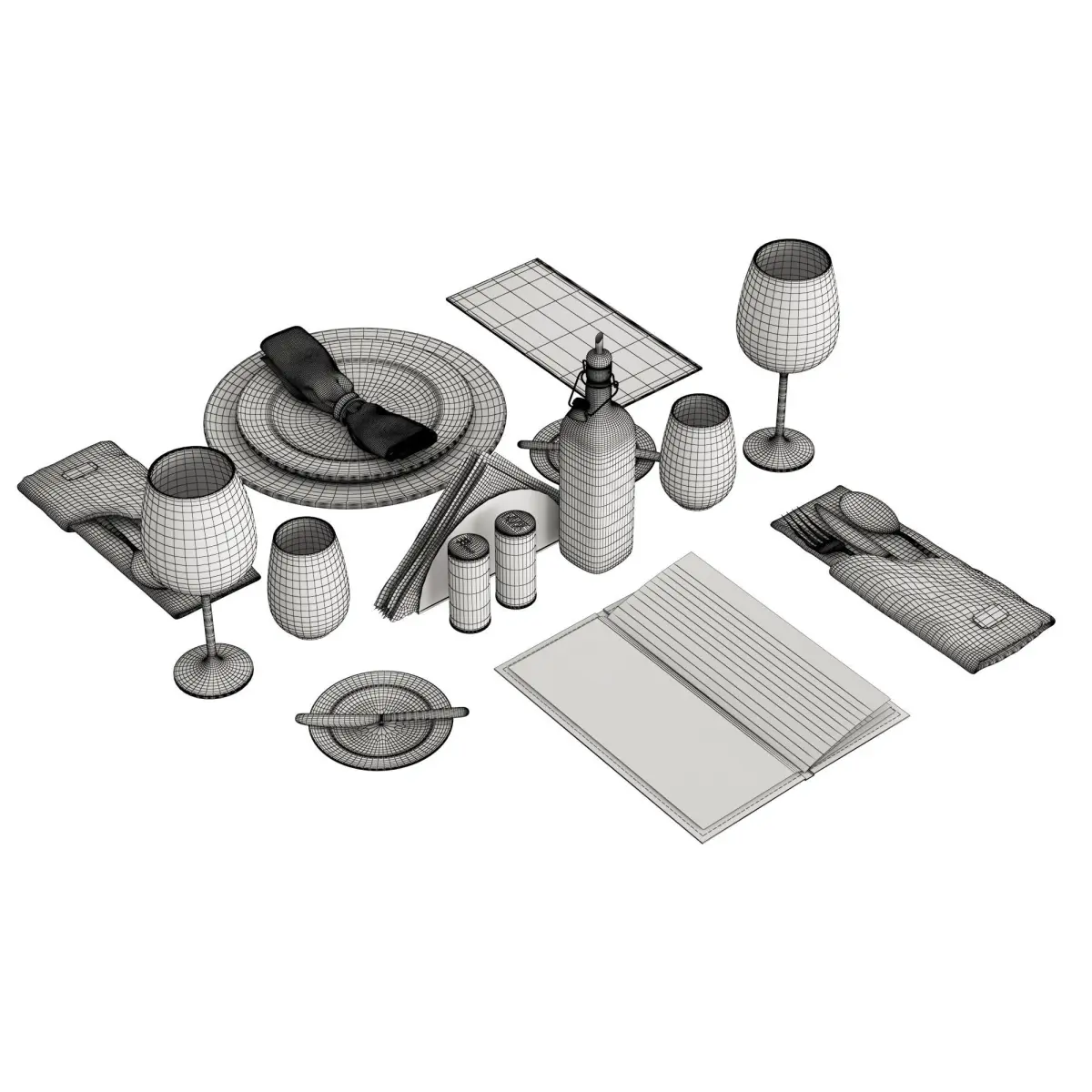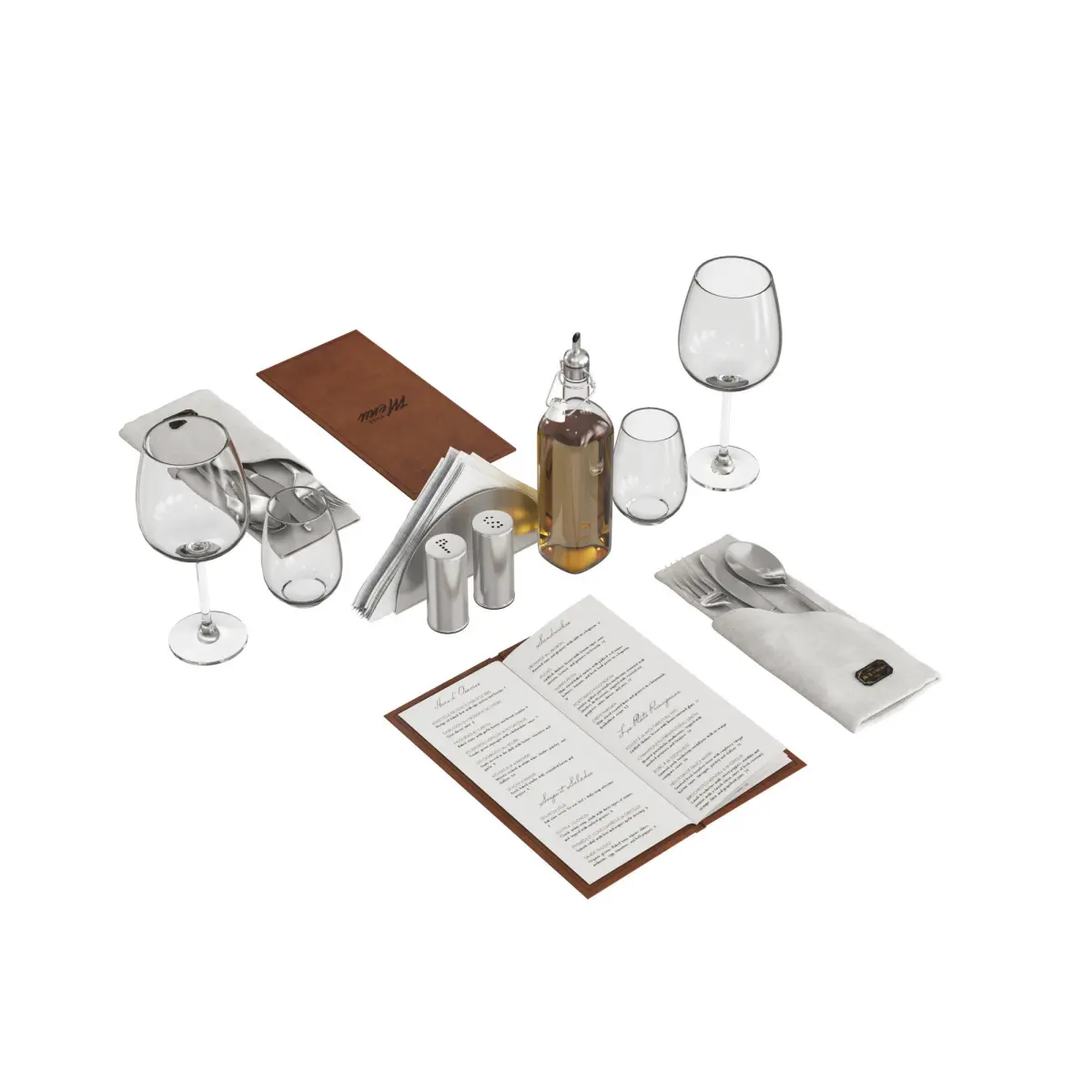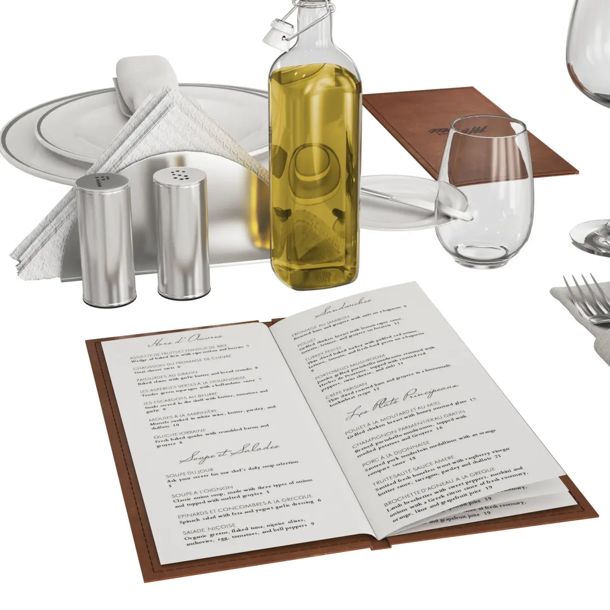 Decorative set for a table in a restaurant.Plates, glasses, napkins, menu