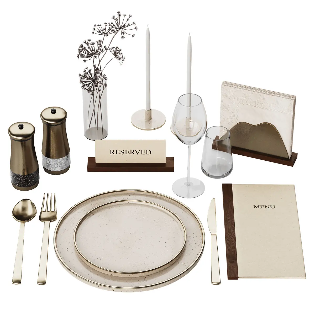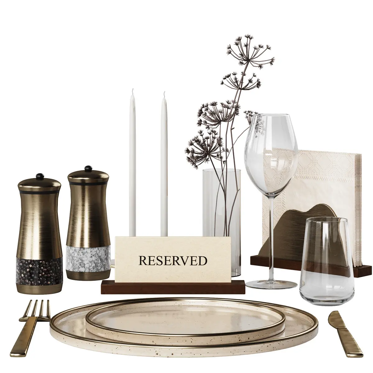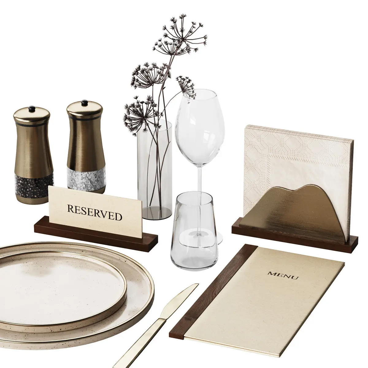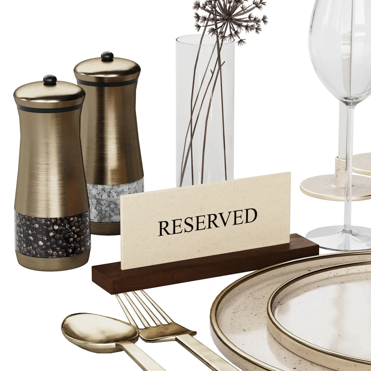Restaurant table setting: dishes, menu, napkin holder, salt and pepper, reservation sign.