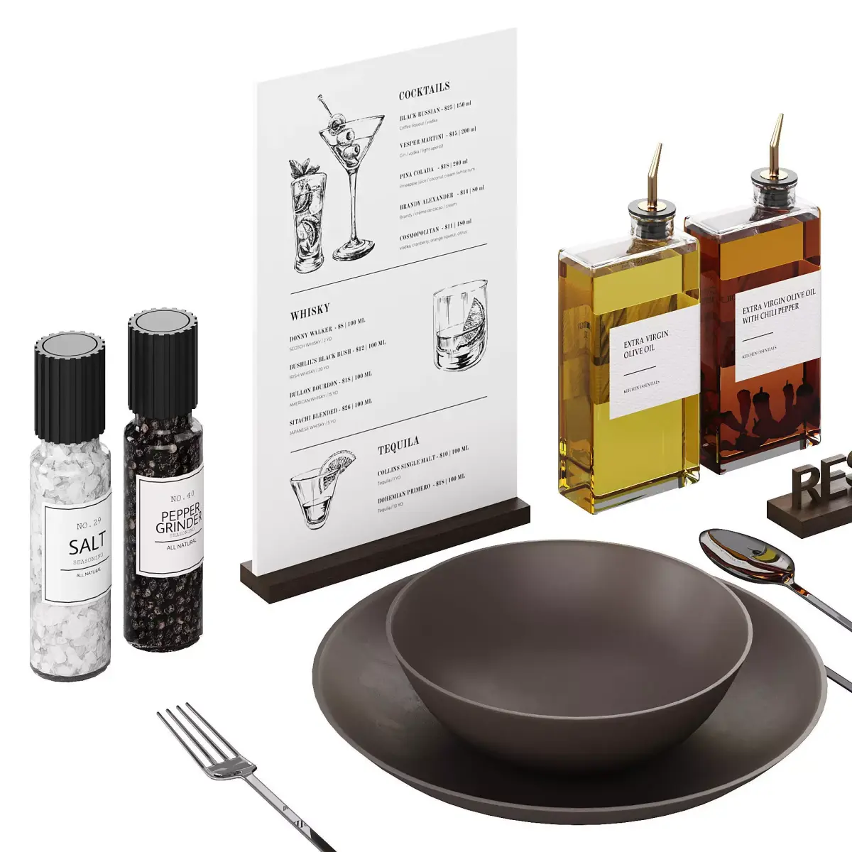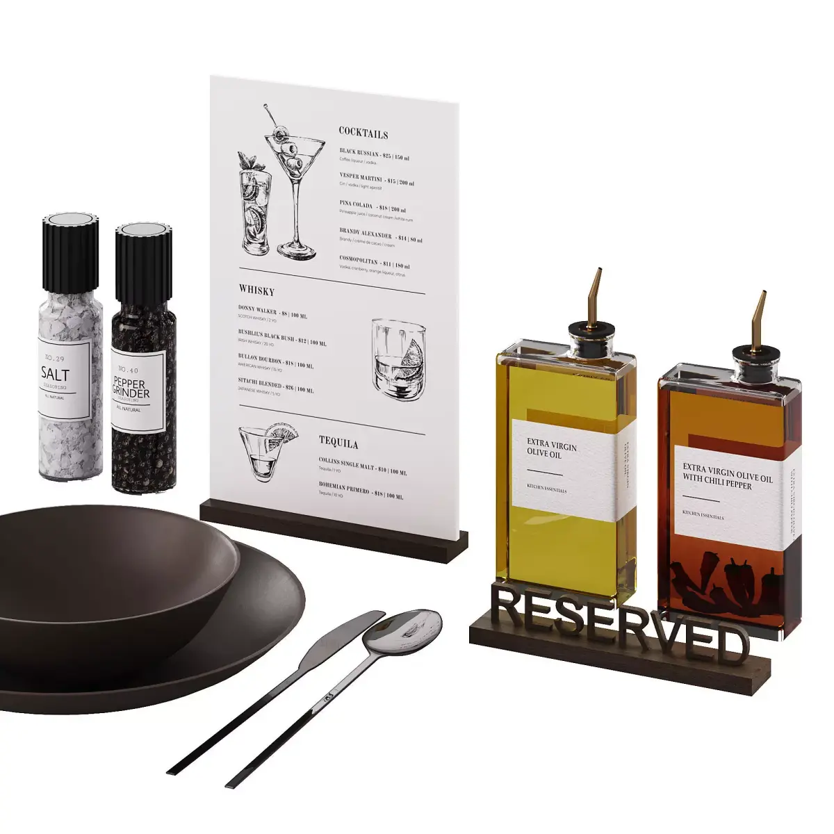 Serving for a restaurant, bar or steak house. Menu, salt, pepper, reserve sign, dishes, olive oil and chili oil.