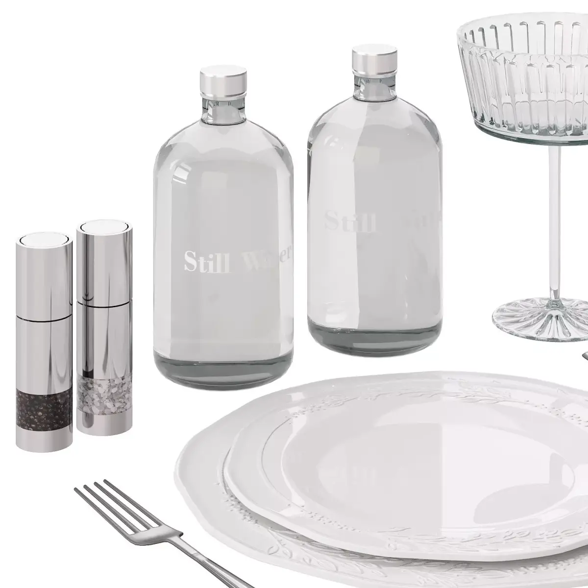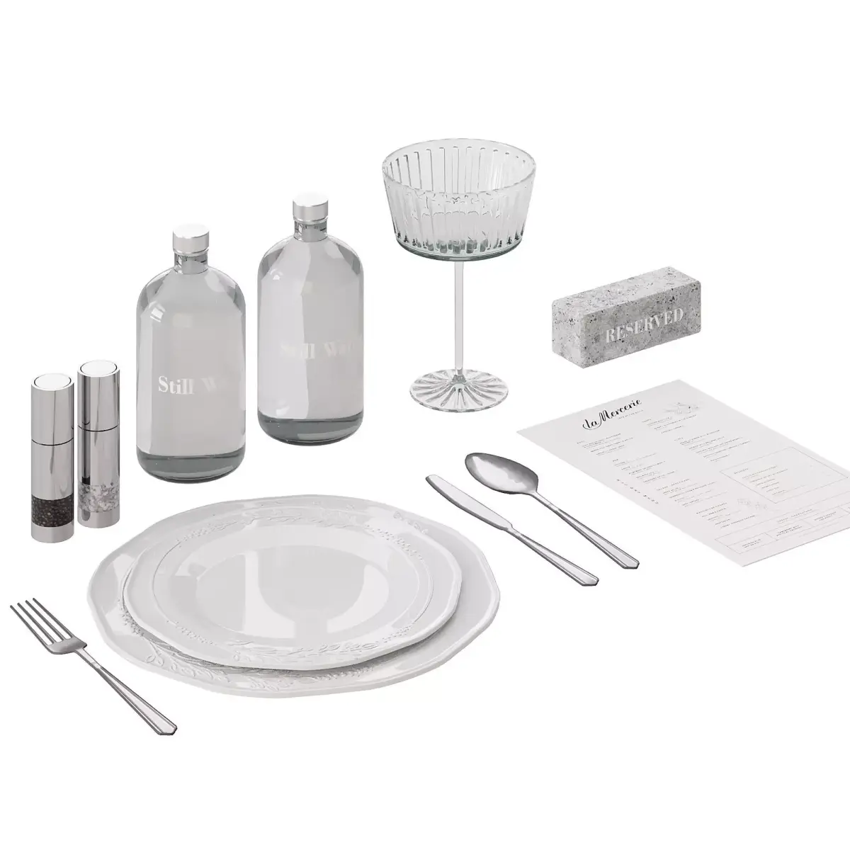 Restaurant table setting in white and grey tones: dishes, menu, salt and pepper, reservation sign, 2 bottles of water.