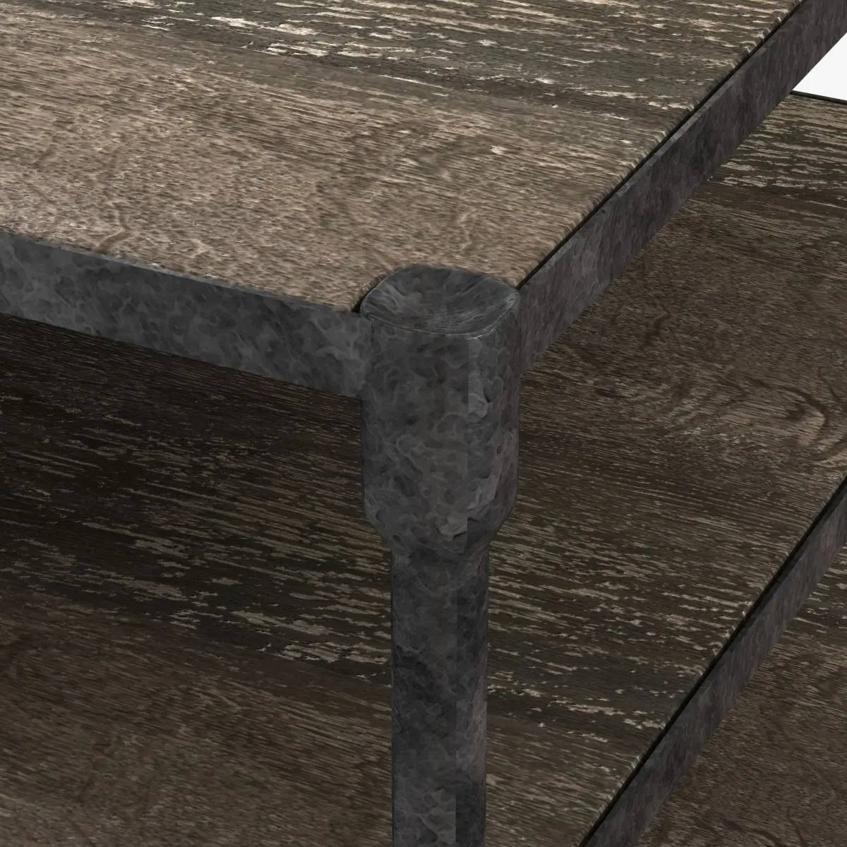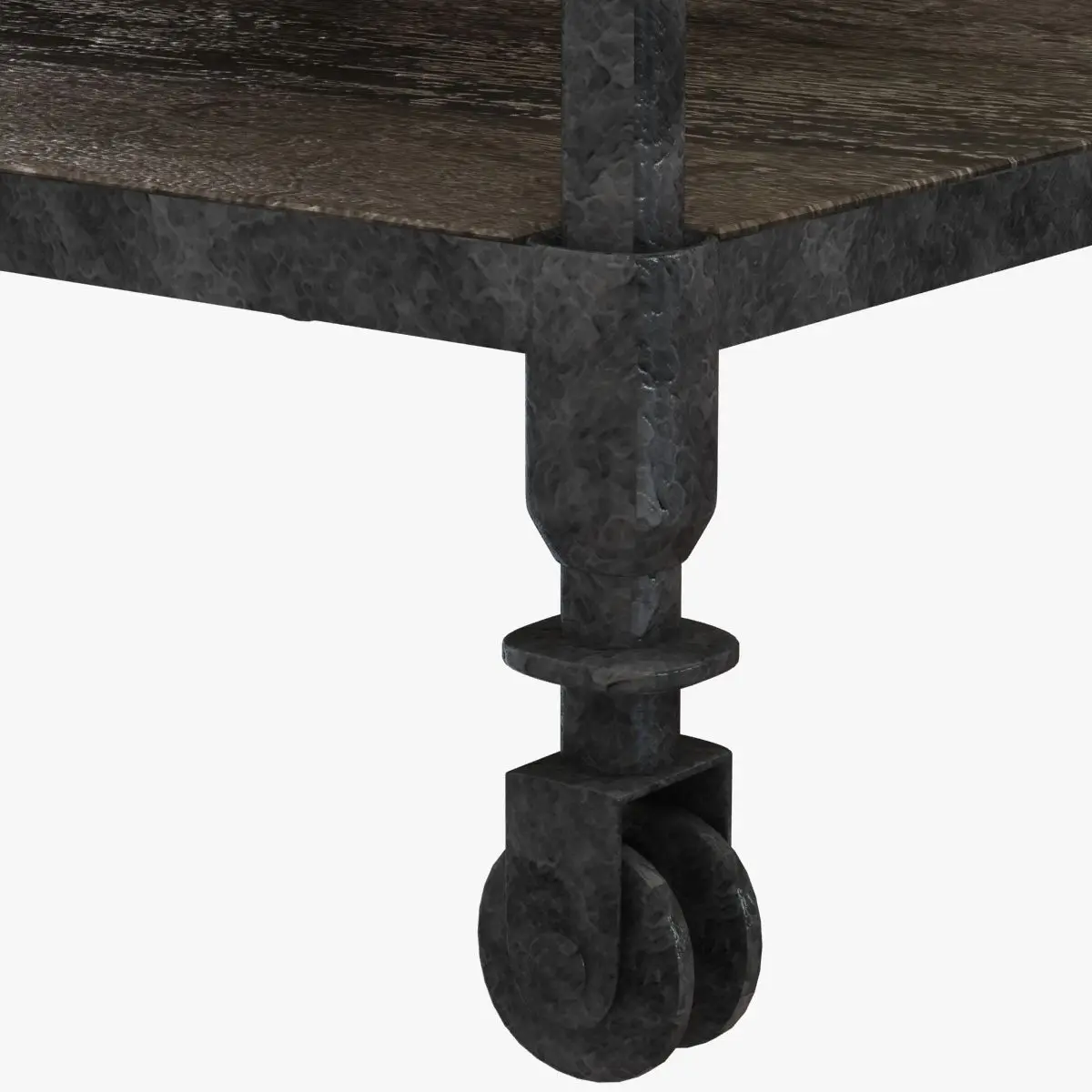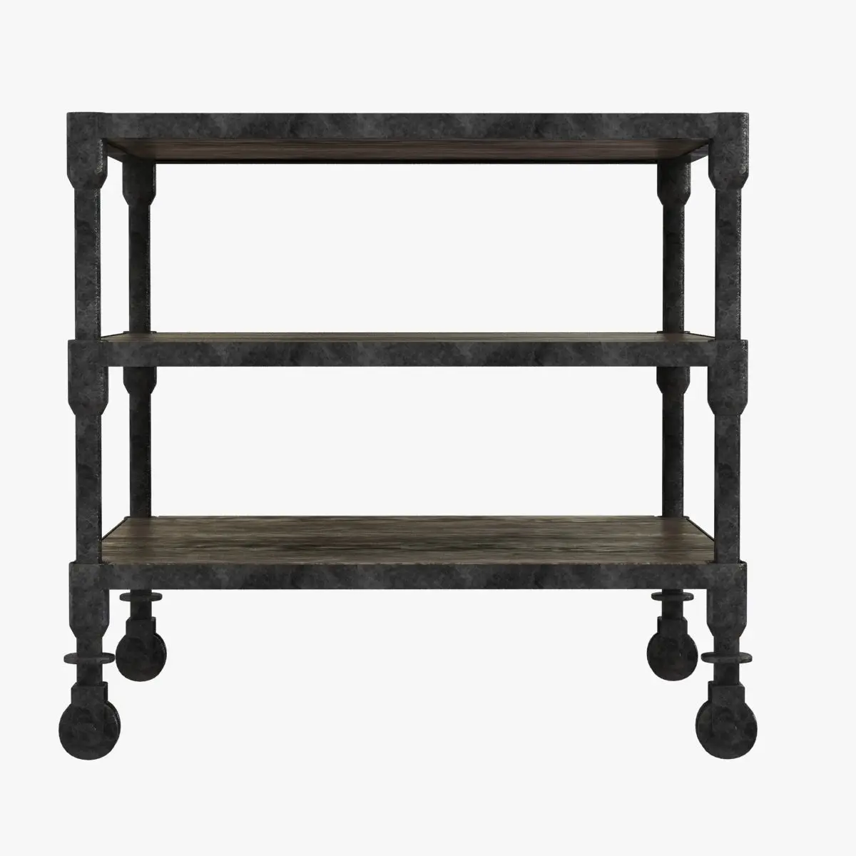 Our distressed table pairs the warmth of reclaimed elm with warm, aged metal frames for an industrial, imperfect look.Hand-applied patinaFunctioning caster wheelsExpansive shelves offer ample storage and a showcase for art booksGiven their previous lives as antique doors, the shelves and table top may have holes. Nicks, nail marks and imperfections reveal the wood's age and provenance.Wipe with a soft, dry clothDIMENSIONS28' sq., 26'H