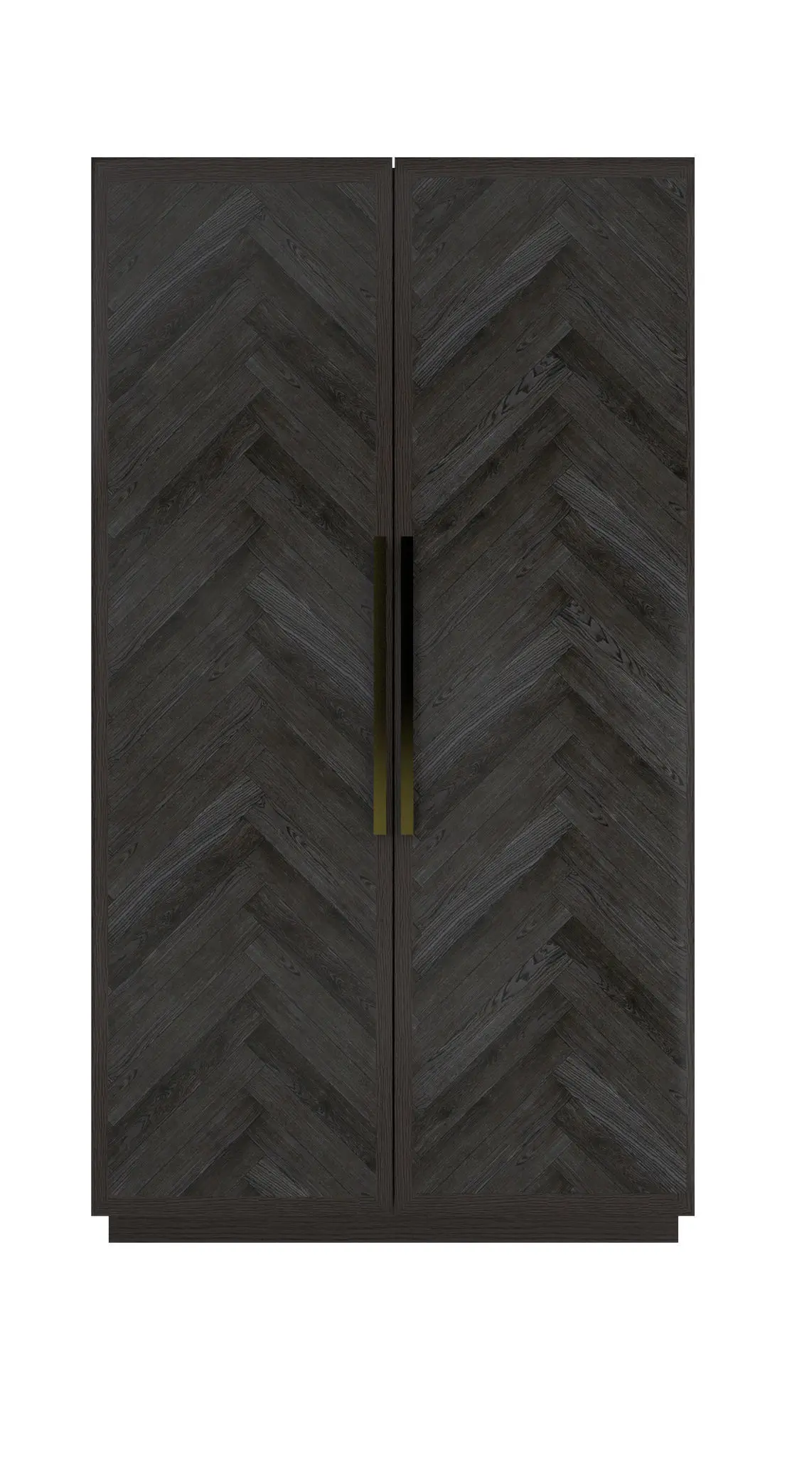 2 Door Cabinet with Weathered Brown Oak Wood Finish, Herringbone pattern on Door panels