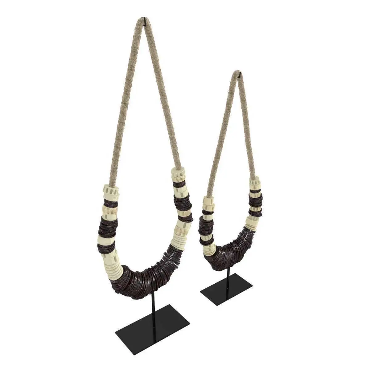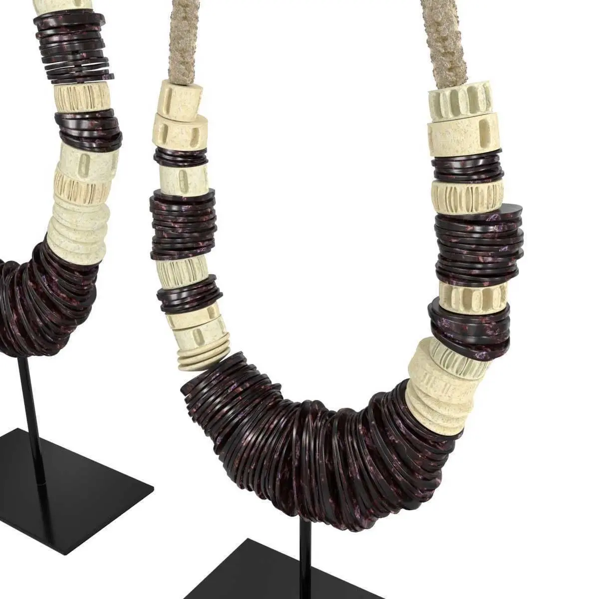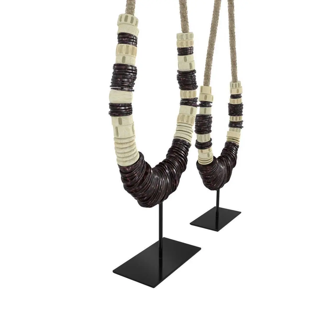 Ancient Indonesian coins sliced from sea shells are strung by hand to create our ceremonial necklaces. We've mounted them on iron stands to showcase their textural, sculptural beauty. Variations in the shells and the work of the artisan make each piece unique.