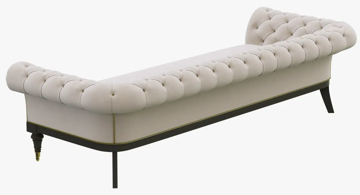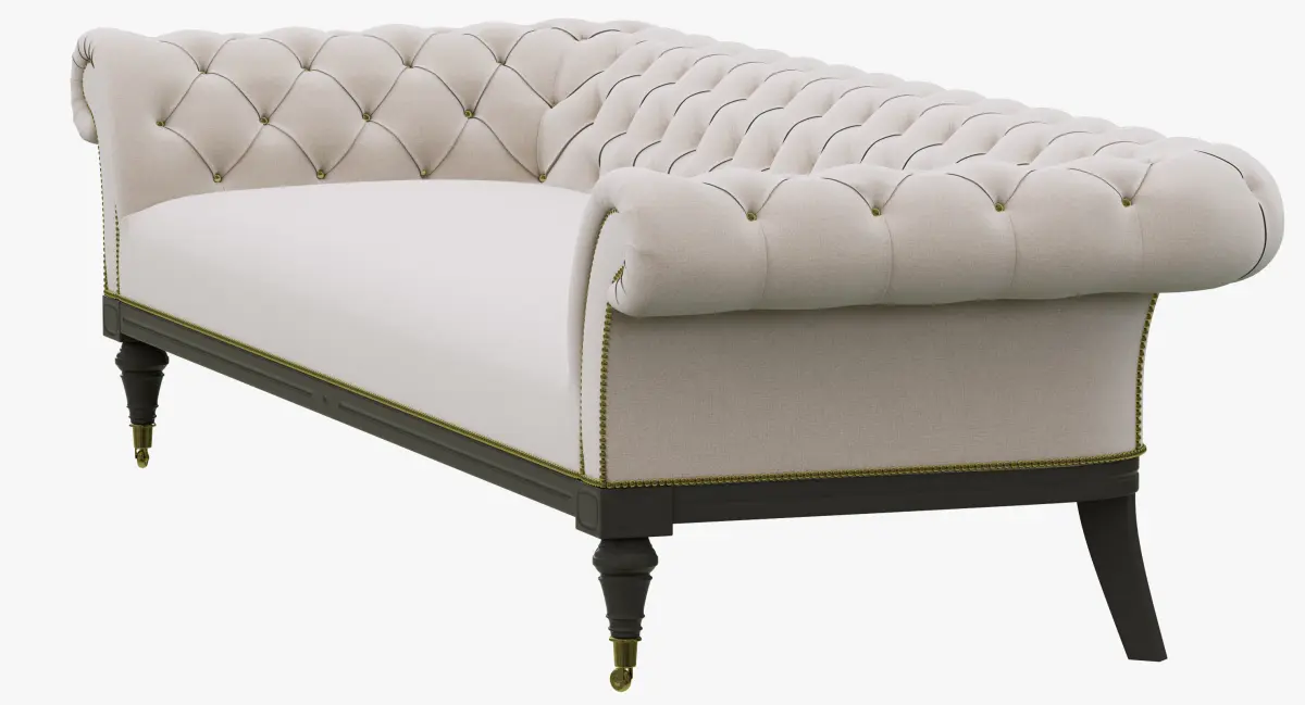 Flaring scroll arms and two rows of antique brass nailhead trim lend panache to the silhouette of a traditional Chesterfield sofa. Patterned after a 1920s London antique, the sofa has a low profile and deep bench cushion. The button-tufted back and sides offer sink-in comfort.