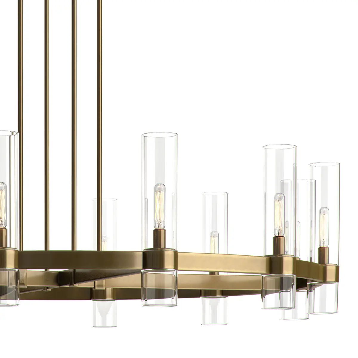 RESTORATION HARDWARE RAVELLE ROUND CHANDELIER Brass.Art Deco forms are reimagined with a modern minimalist sensibility in this collection from renowned lighting designer Ian K. Fowler. Crafted of solid steel, unadorned metal bands hold the slender glass cylinders in place, in a state of perfect equipoise. Within each, Edison bulbs glow like flickering candles.