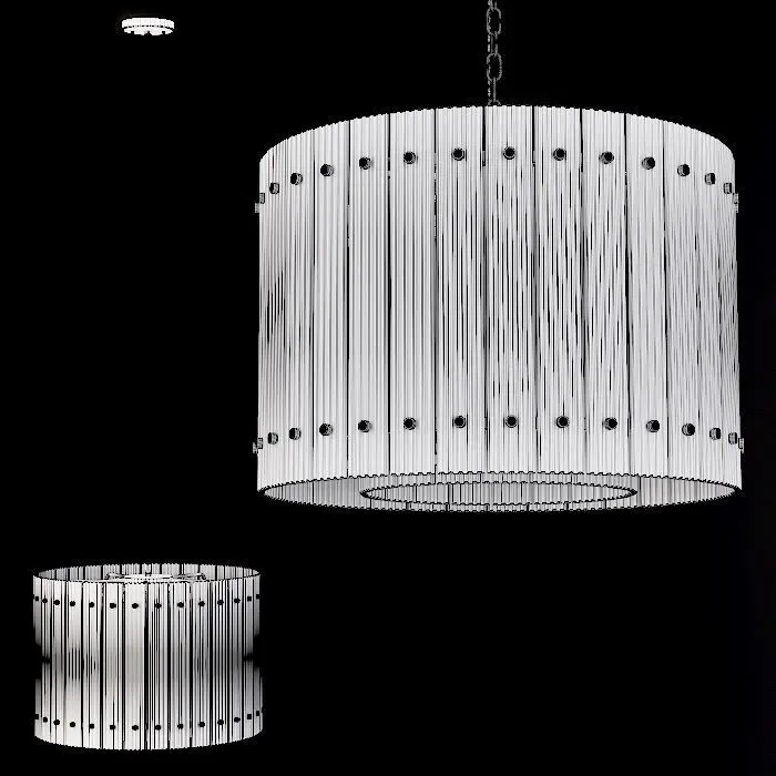 Fixture by renowned designer Theo Eichholtz evokes the glamour of 1960s Italian glass lighting. Arranged within a sleek metal frame, dozens of glass panes are raked by hand to create a fluted texture, producing a dramatic play of light and a softly diffused glow.