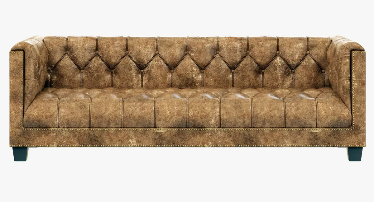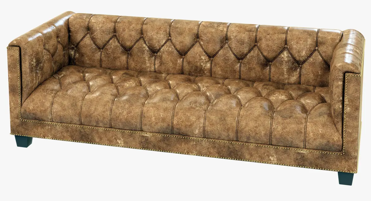 Evoking the tailored elegance of English Art Deco furniture of the 1920s, our sofa features a square frame and deep button tufting. Sheltering arms envelop, and antique-brass nailheads anchor and define the supple leather.