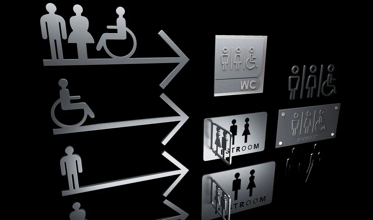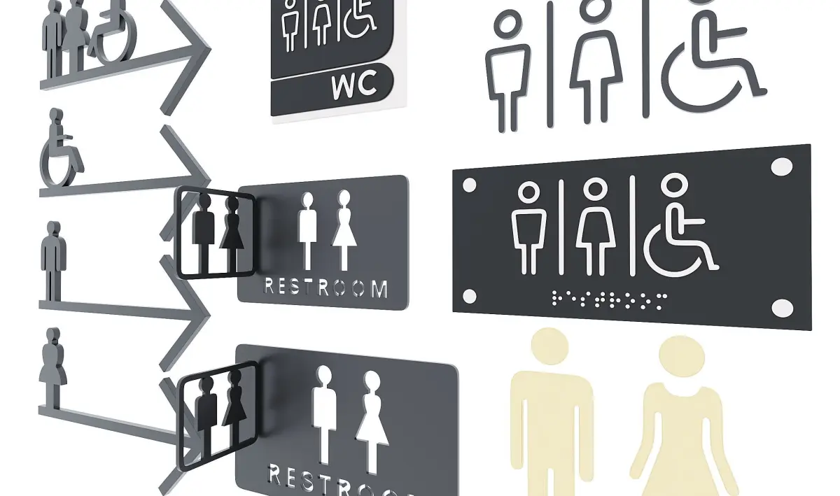 "Highly detailed 3D model collection of restroom directional door signs, perfect for creating realistic interiors of public buildings. The model includes various options for men's and women's restrooms, designed in a modern style. All models feature high-quality textures and are ready to render.