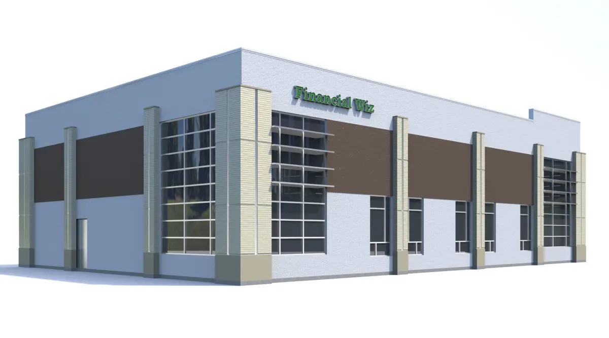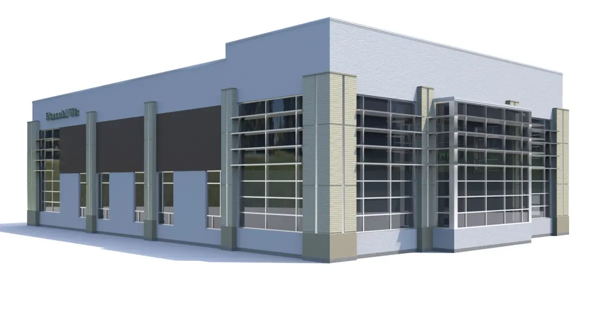 Office Building, Retail building, Store.-3D model of a office building-Interior walls and glass doors, and hollow metal doors included-Brick, EIFS, Stone, Concrete, Glass, Metal
