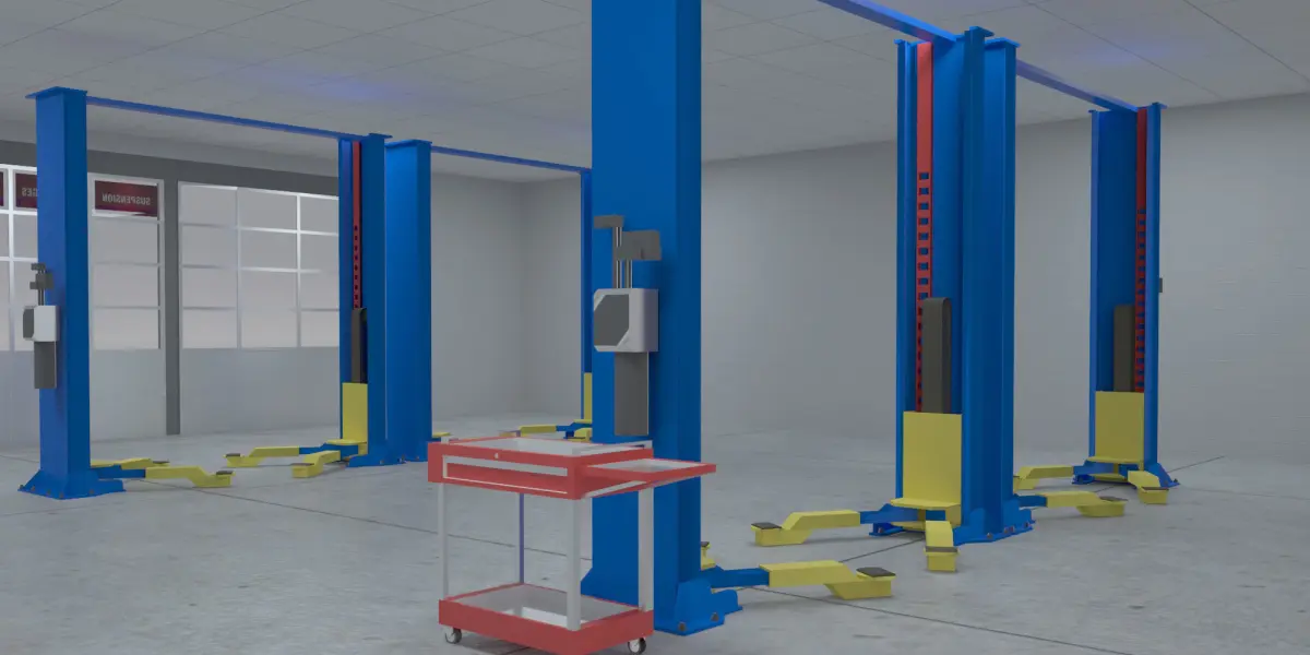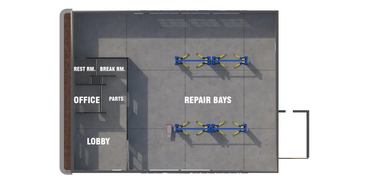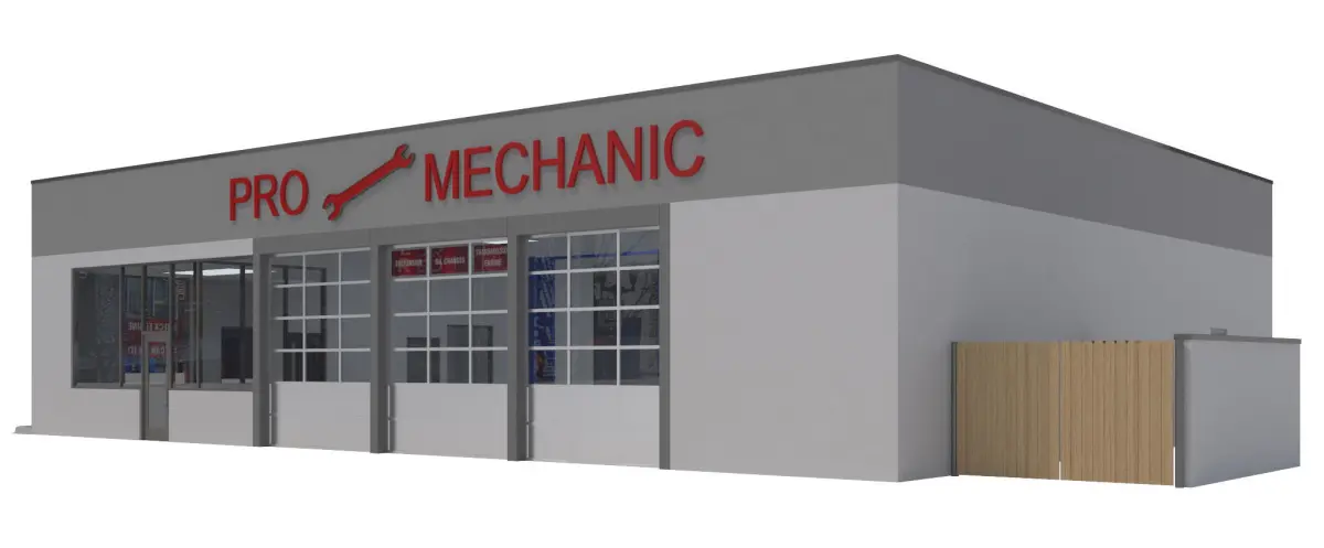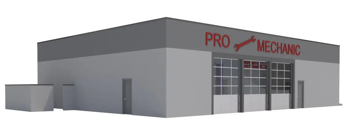 -Painted CMU blocks, concrete floor.-Building has 6 garage bays and 4 car lift ports and a tool cart included. Interior also has an office, lobby, restroom modeled with walls, No Furniture.-Advertisement Signage also included.