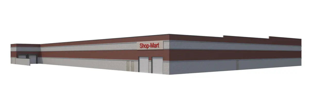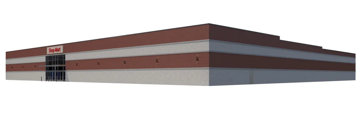 3D Exterior Model of a Commercial Retail StorePerfect building for a grocery, electronics or any other type of store.Could be placed on its own or on a mall site.