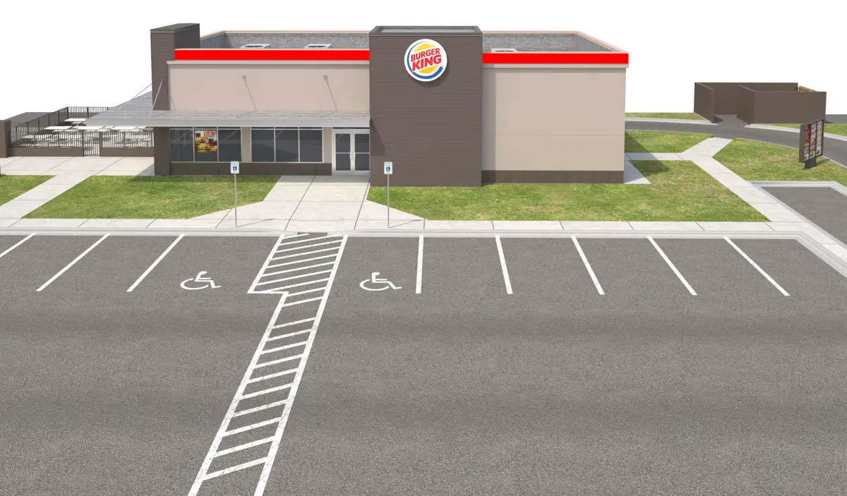 -Model includes:*Exterior Enclosure*Canopy*Burger King Signs*Roof top mechanical units on curbs*Textures*Switchgear Box with warning sign*Doors and windows*Light Fixtures and IES file for lights*Fenced patio area with Outdoor furniture (table and seats)*Trash Enclosure*Parking lot with striping and Handicap parking signs*Curbs, Grass, Sidewalks*Wall around property*Burger King Pylon Sign, Order speaker sign, Menu Board Sign, and Height Clearance signs included *Window Advertisement Signs*Light Fixtures *Road Oil marks
