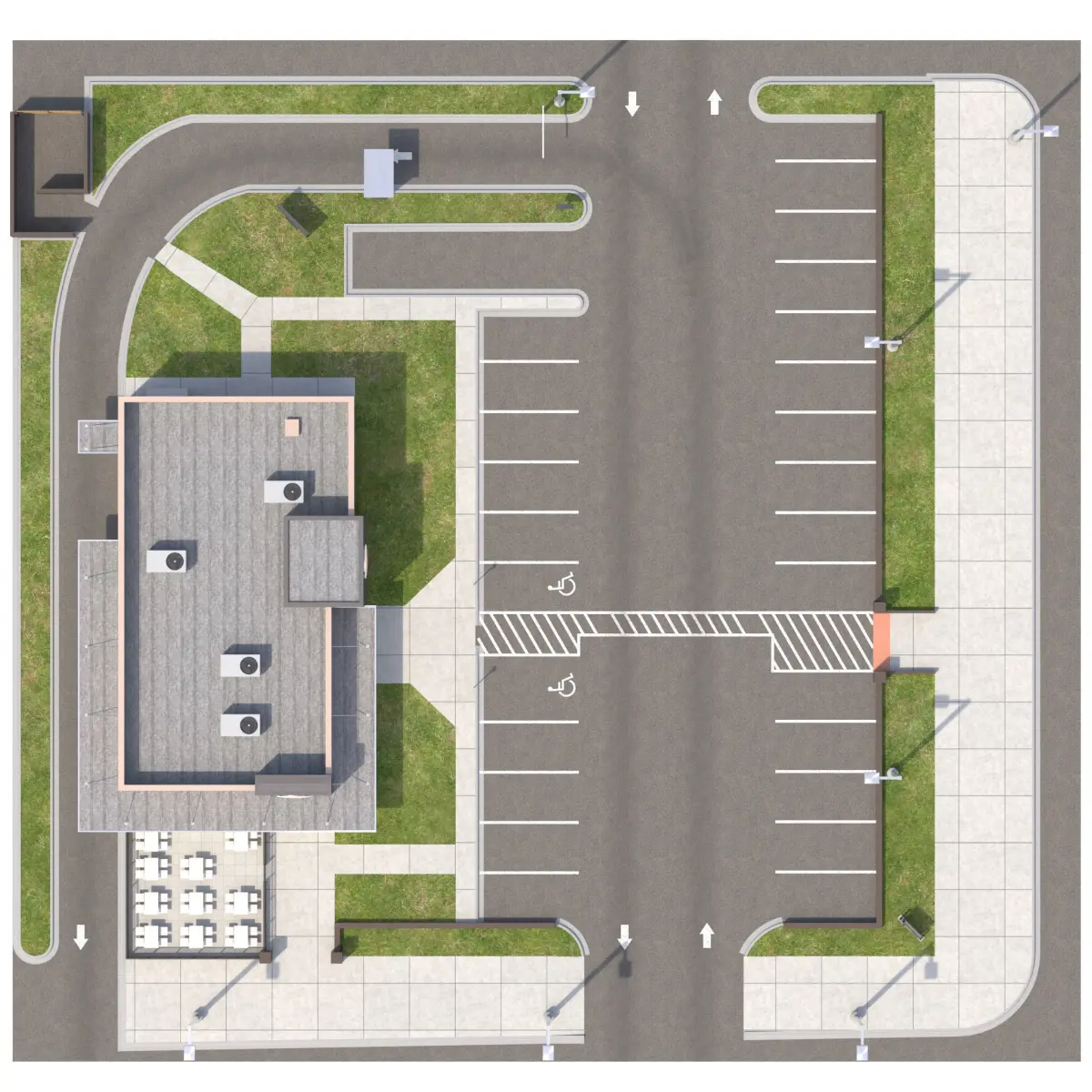 Modeled to Scale and Dimensions: (Imperial)Building: +/- 70' x 37' x 19' at main parapet, 22' at High parapet, Bottom of canopy height is 9'-0'. Polygons: 29,799, Vertices: 38,794Site: 182'x 191' Polygons: 26,037, Vertices: 30,293 (With Grass Subdivision to make it look realistic and 3D)Model Without Grass subdivision: Polygons: 52,898, Vertices: 65,923