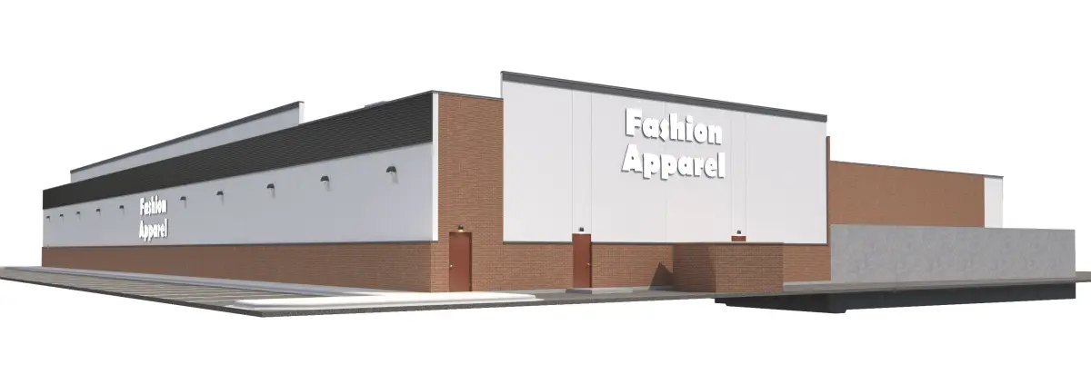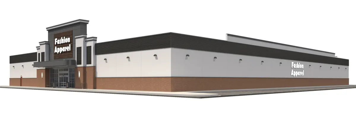 High Detail 3D Exterior Model of a Retail Store: Currently has signage for a generic Fashion store, commercial department store