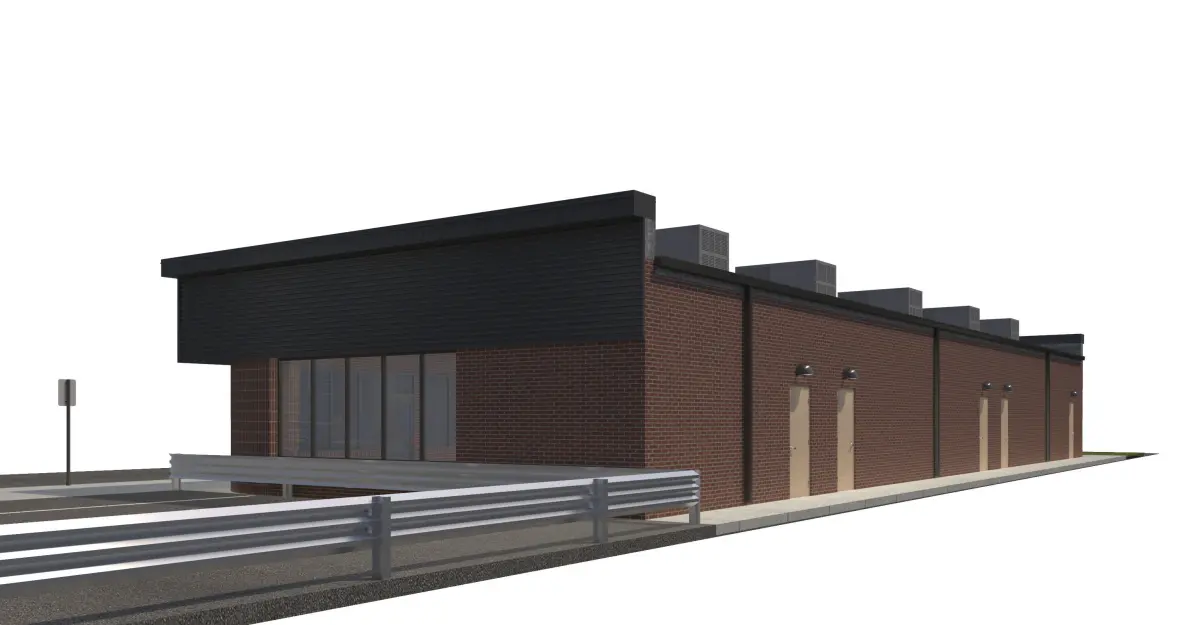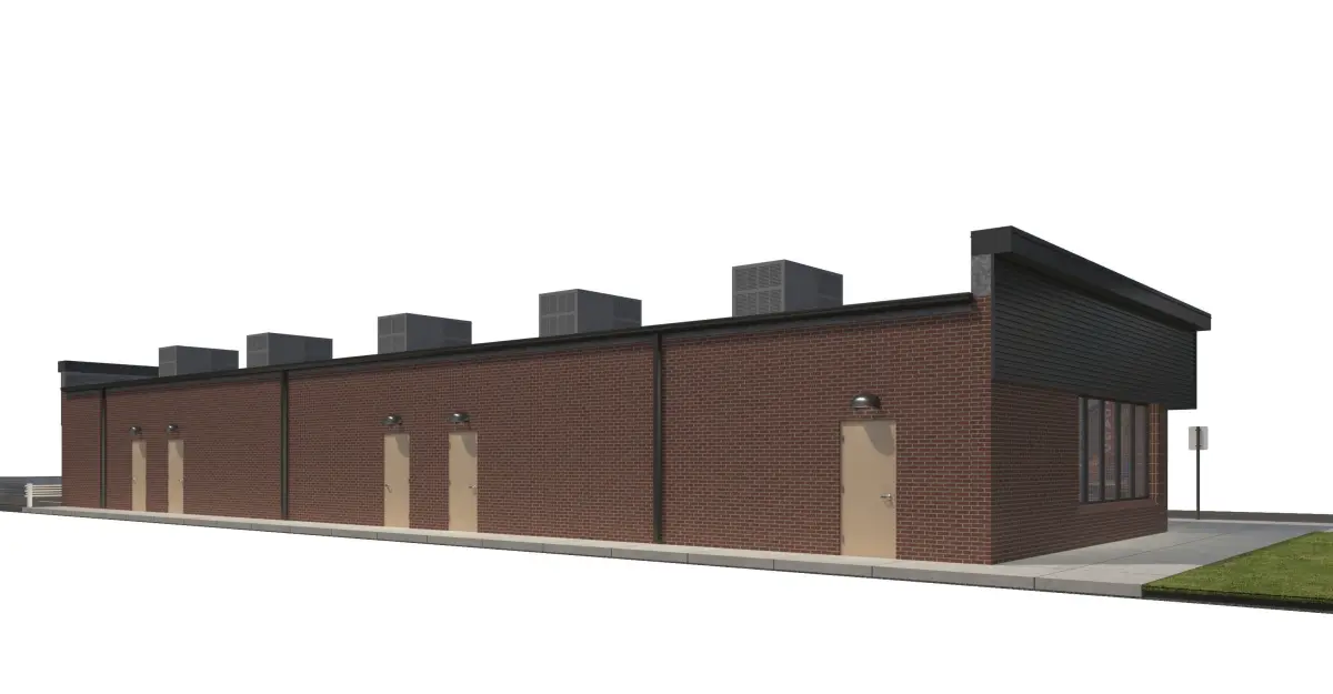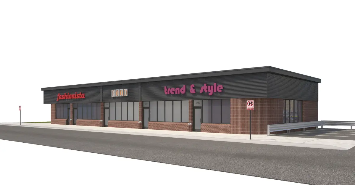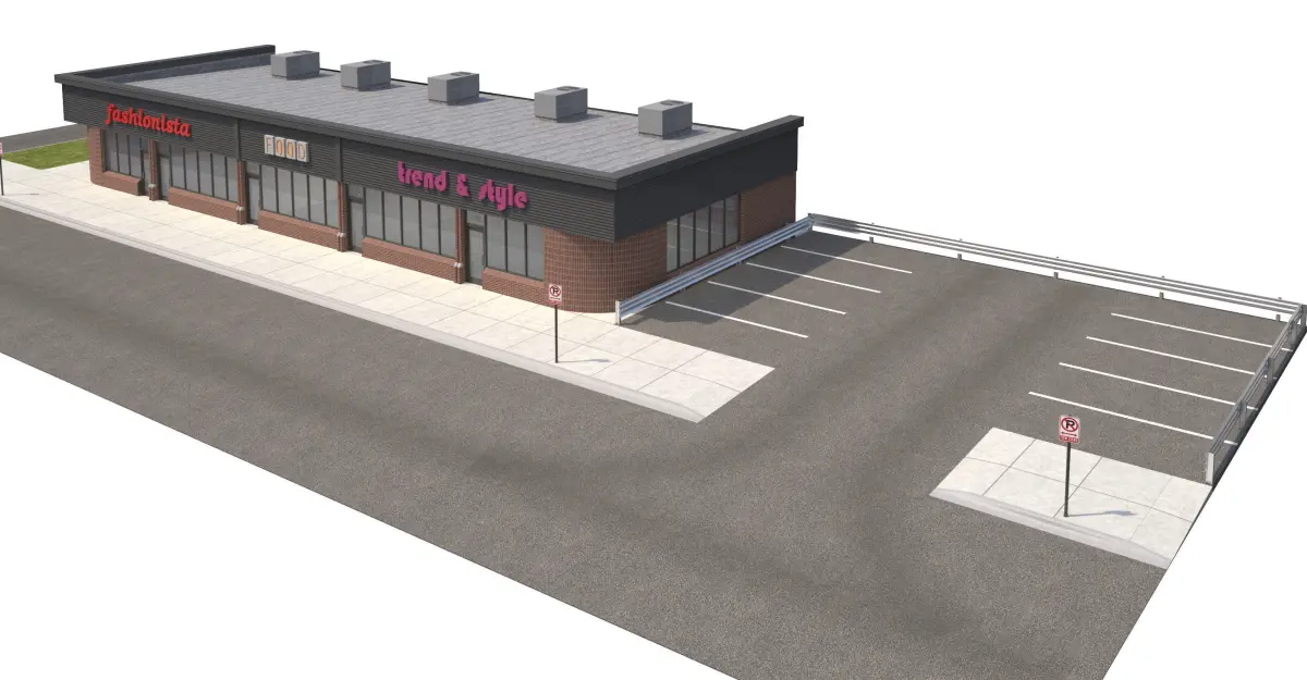 -3D model of a strip mall/outdoor Mall with 5 tenants as shown in renderings