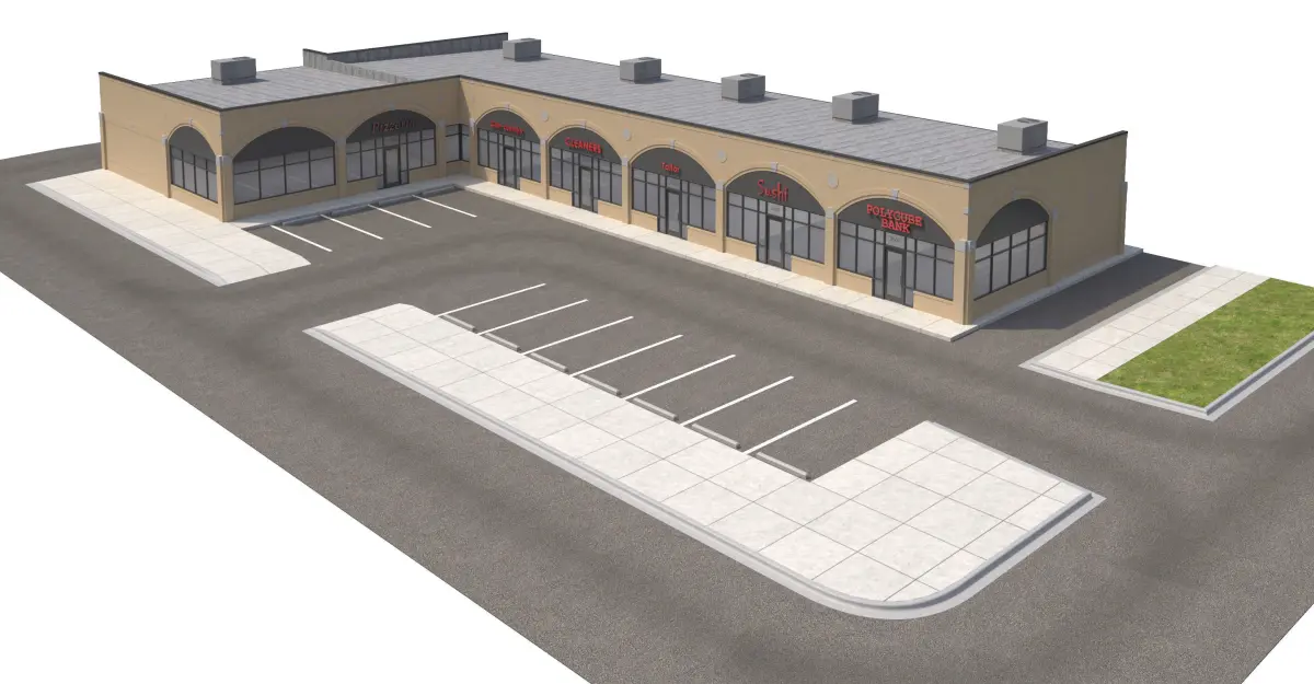 Retail building, Store. Outlot. Strip Mall. L-Shaped Outdoor Strip Mall