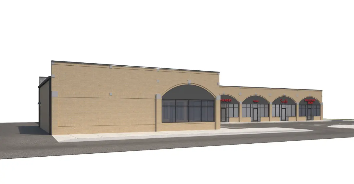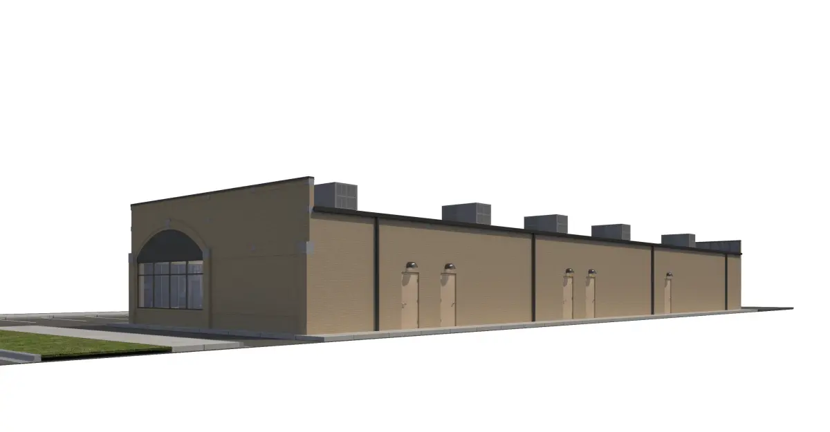 Building has potential for 6 separate stores or other combinations. Tan brick (running bond and stack bond) façade with Stone and Eifs Facade. Included with model is front sidewalk, side parking lot, side sidewalk for street connection, rear sidewalk and doors, everything shown in rendering