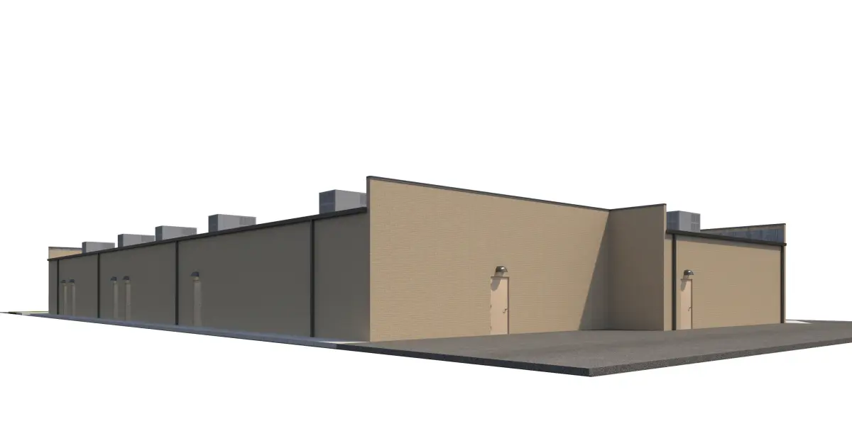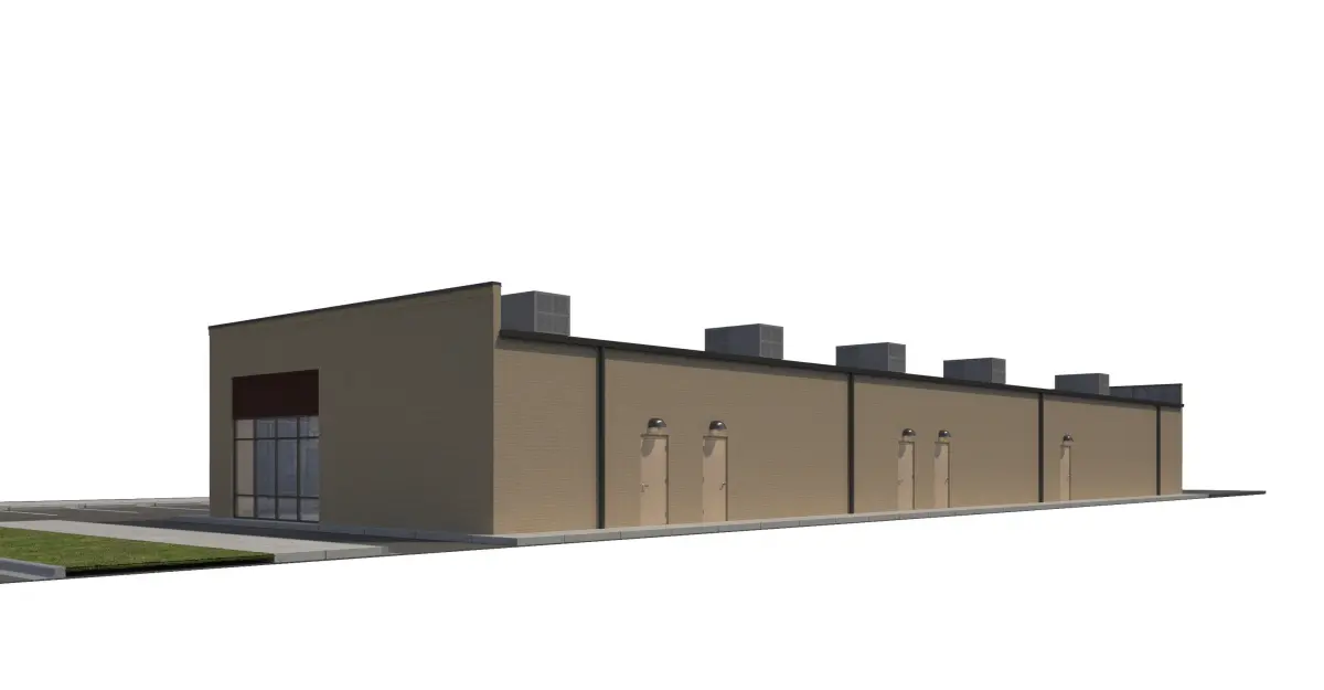 Building has potential for 6 separate stores or other combinations. Tan brick (running bond and stack bond) façade and Wood Panels. Included with model is front sidewalk, side parking lot, side sidewalk for street connection, rear sidewalk and doors, everything shown in rendering