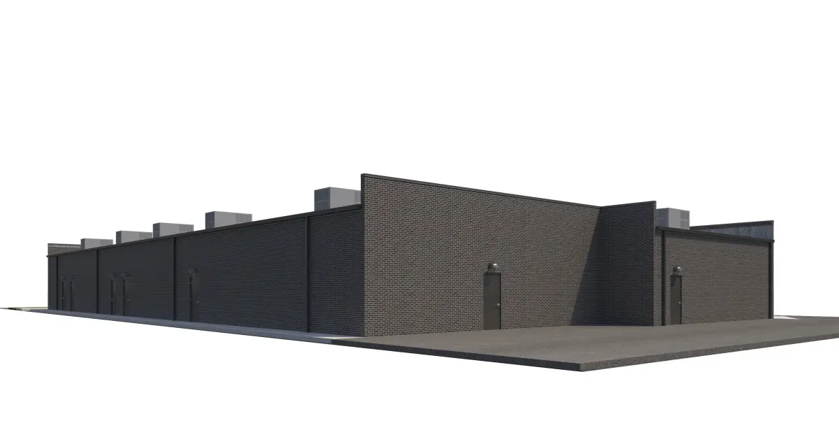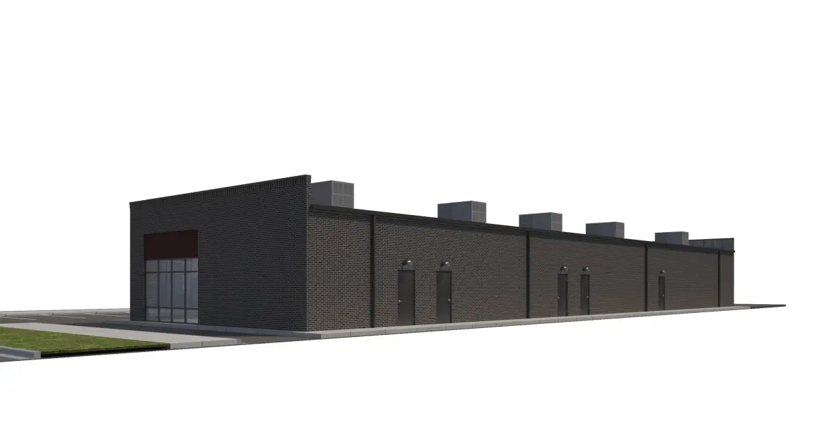 Building has potential for 6 separate stores or other combinations. Black brick (running bond and stack bond) façade and Wood Panels. Included with model is front sidewalk, side parking lot, side sidewalk for street connection, rear sidewalk and doors, everything shown in rendering
