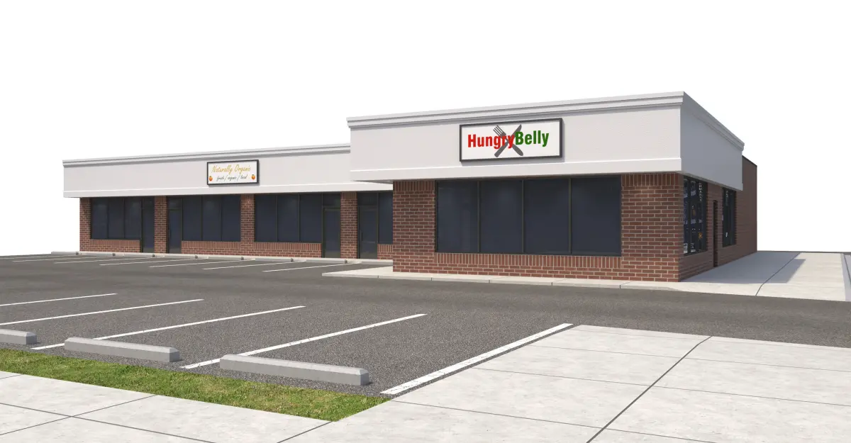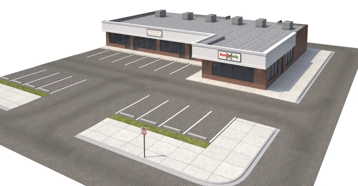 Retail building, Store. Outlot. Strip Mall. L-Shaped Outdoor Strip MallPerfect for a liquor store, Grocery Store, cell phone store, restaurant and any other retailer.