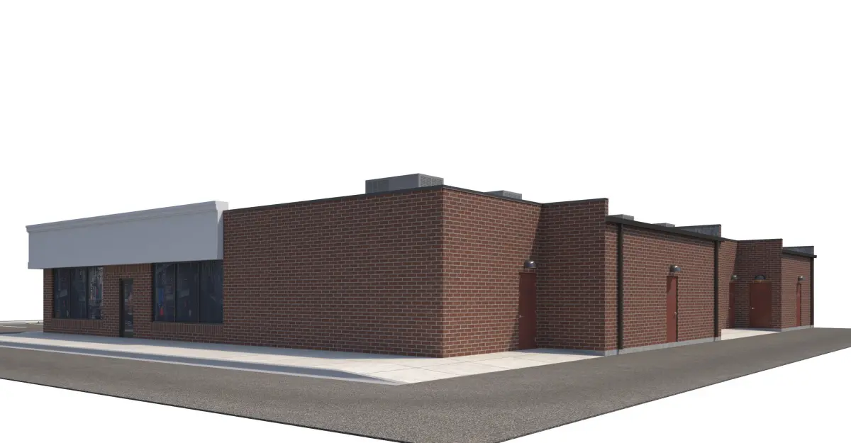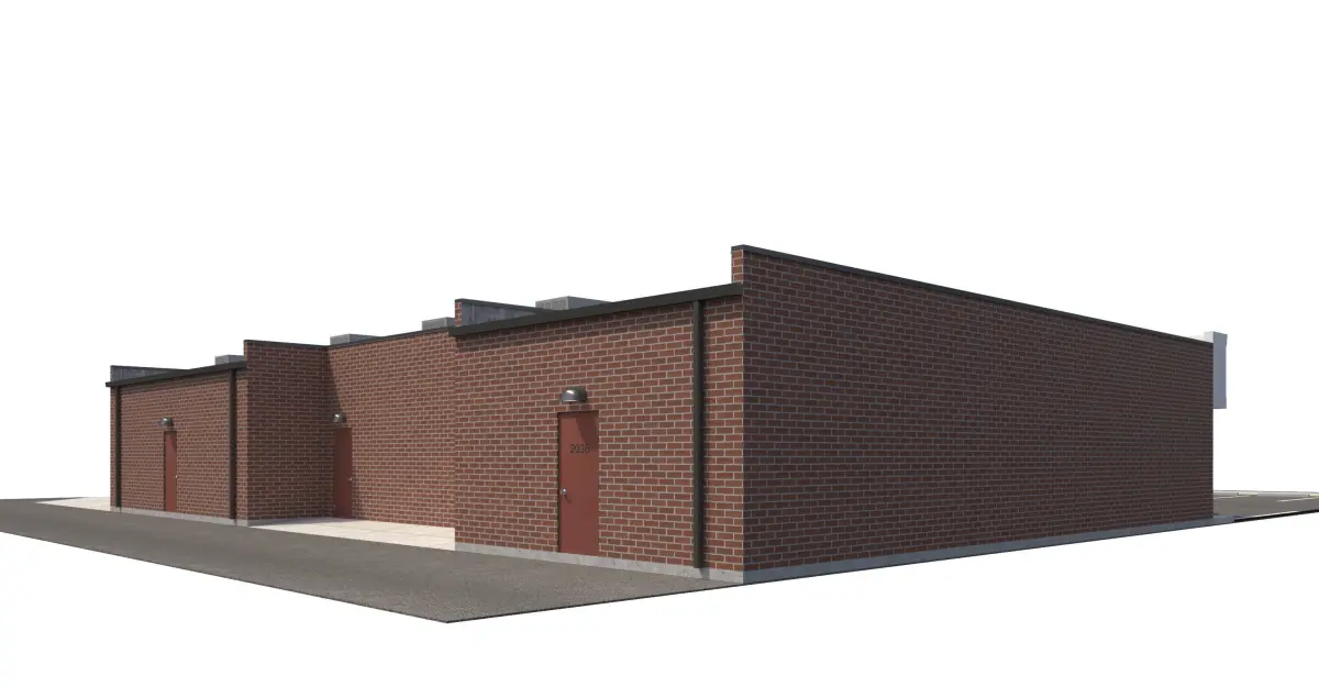 Building has potential for 5 separate stores or other combinations. Red brick (running bond and soldier course) façade, and Eifs overhang. Included with model is front sidewalk, side parking lot, side sidewalk for street connection, rear sidewalk and doors, everything shown in rendering