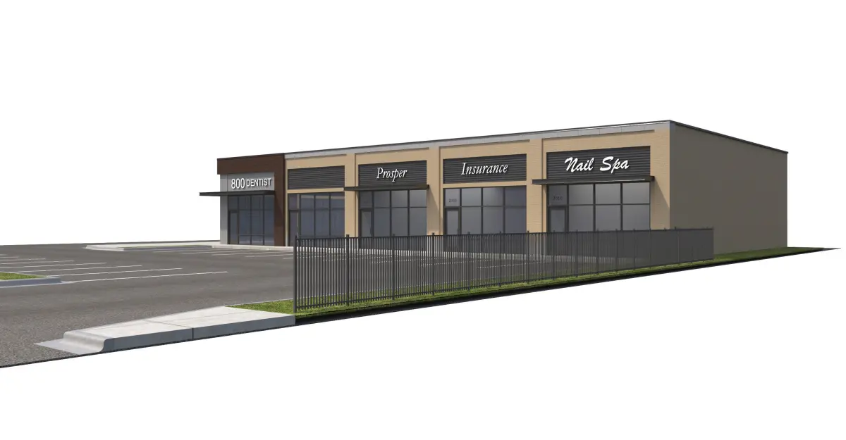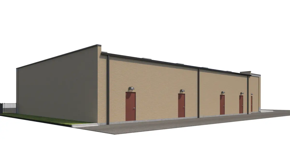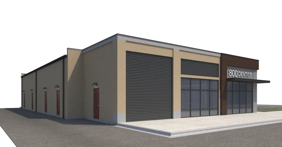 Building has potential for 5 separate stores or other combinations. Tan brick, Cast Stone, Metal Panel, and Wood Panel, Corrugated Metal Panel façade. Included with model is front sidewalk, side parking lot, side sidewalk for street connection, rear sidewalk and doors, everything shown in rendering