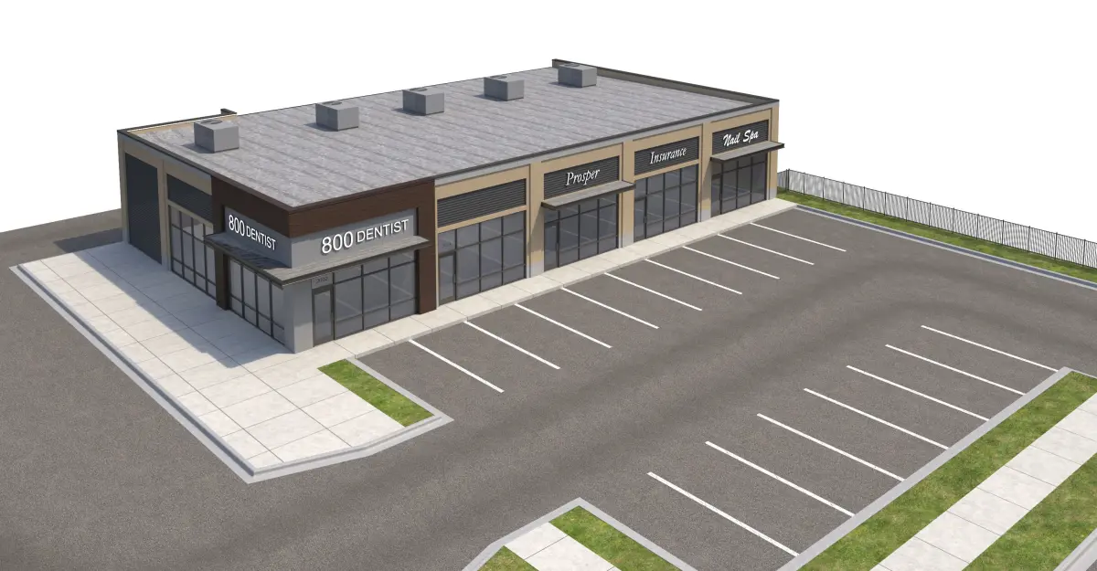 -3D model of a strip mall/outdoor Mall with tenants as shown in renderings-Modeled to Scale and dimensions: Imperial Units: Building: 58'x95'x18' High, Entire Model Site: 180' x 146'. About 5,500 square foot building.