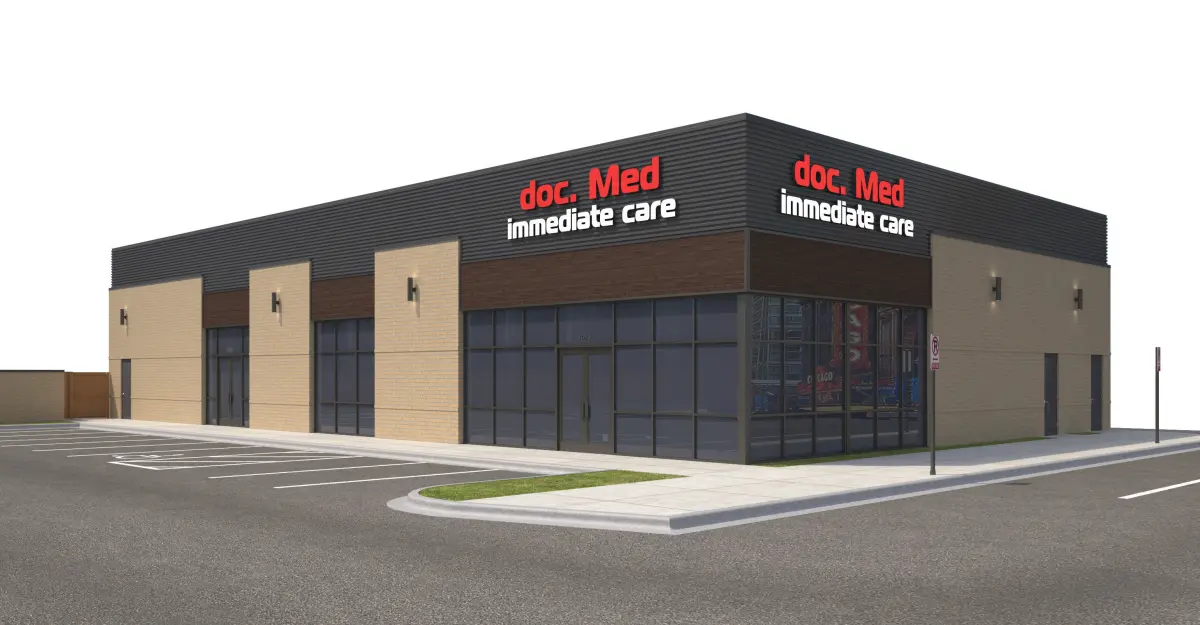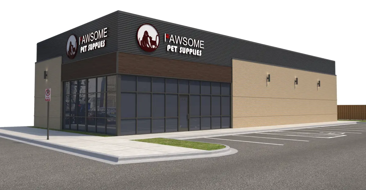Yellow brick, Corrugated Metal Panel, and wood panel façade. Included with model are Canopies, front sidewalk, side parking lot, side sidewalk for street connection, rear sidewalk and doors, everything shown in rendering