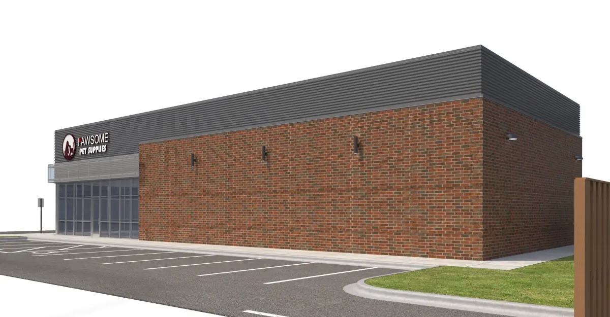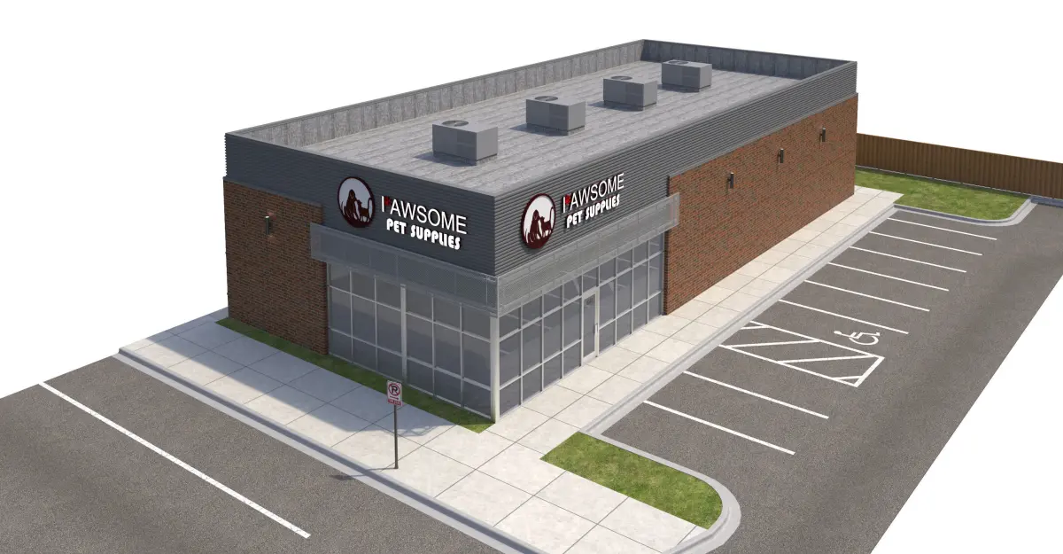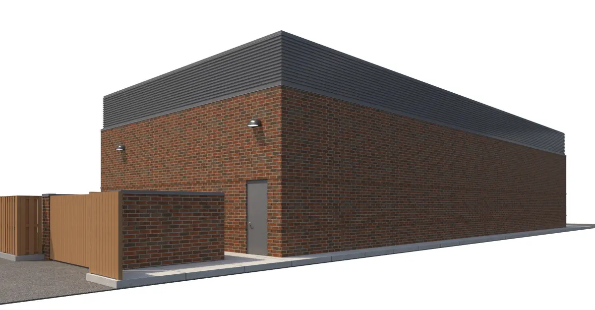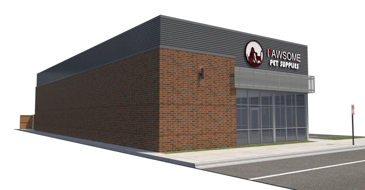 Red brick, corrugated metal panel, and perforated metal panel façade. Included with model is front sidewalk, side parking lot, side sidewalk for street connection, rear sidewalk and doors, everything shown in rendering