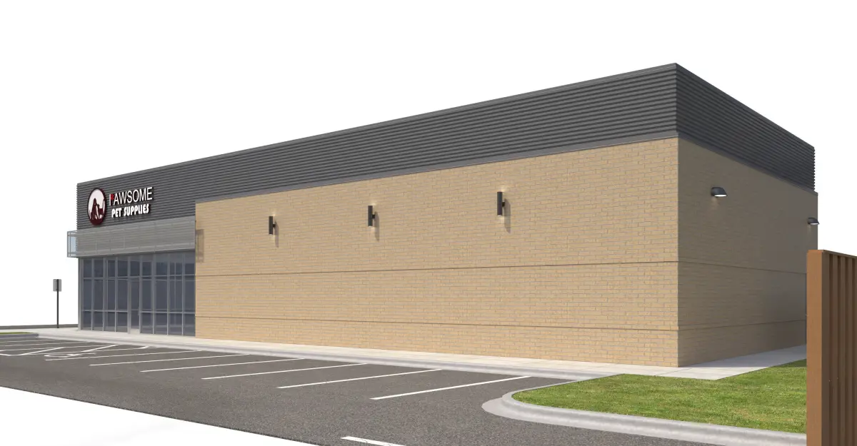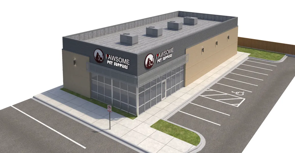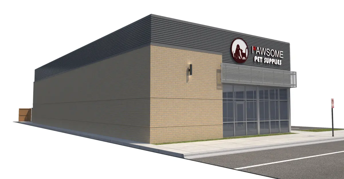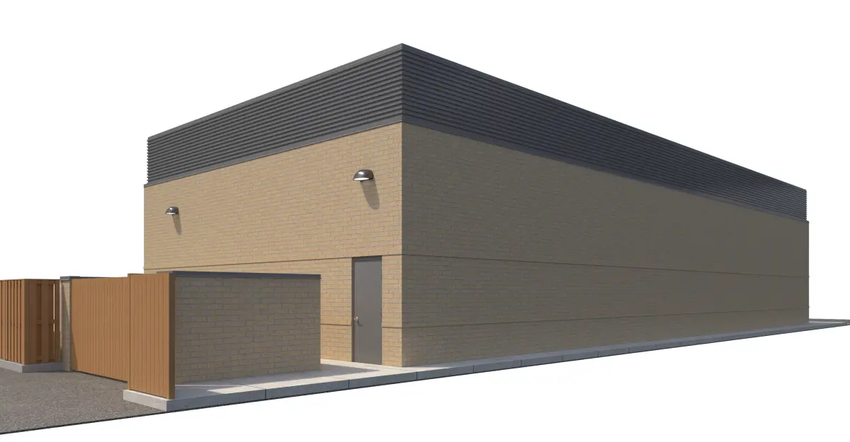 Yellow brick, corrugated metal panel, and perforated metal panel façade. Included with model is front sidewalk, side parking lot, side sidewalk for street connection, rear sidewalk and doors, everything shown in rendering