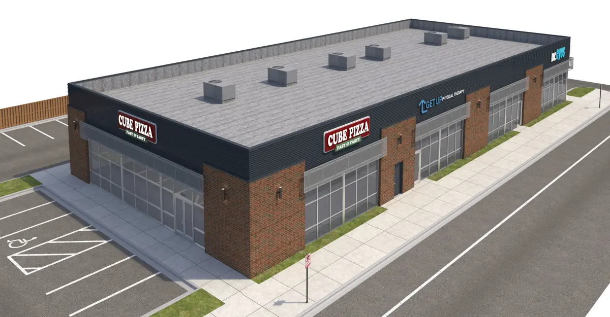 Red brick, Corrugated Metal Panel, and Perforated Metal panel façade. Included with model is front sidewalk, side parking lot, side sidewalk for street connection, rear sidewalk and doors, everything shown in rendering