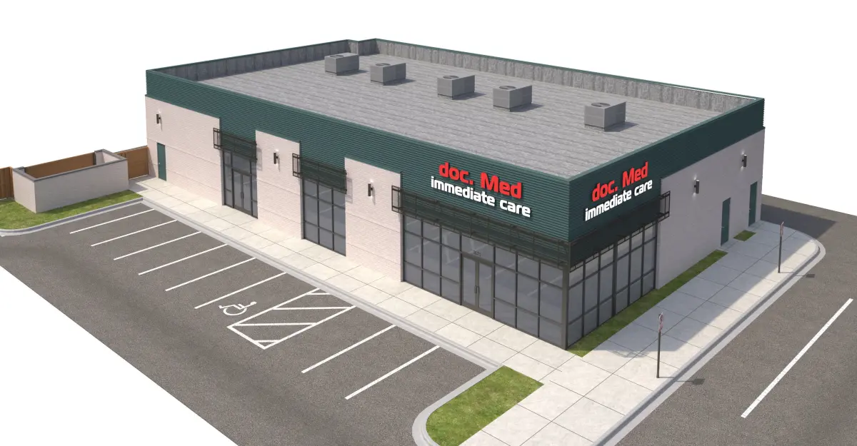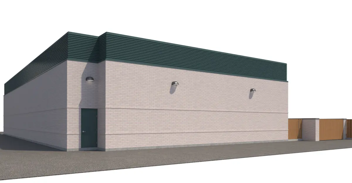 White brick, corrugated metal panel, and perforated metal panel façade. Included with model is front sidewalk, side parking lot, side sidewalk for street connection, rear sidewalk and doors, everything shown in rendering