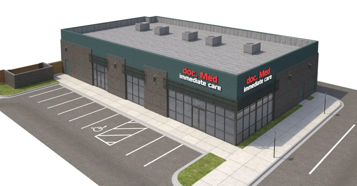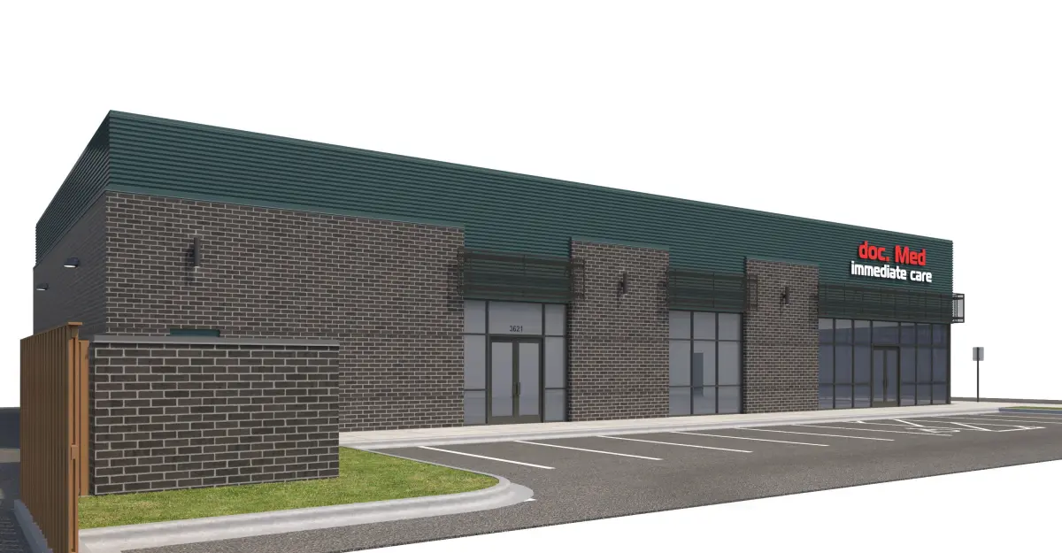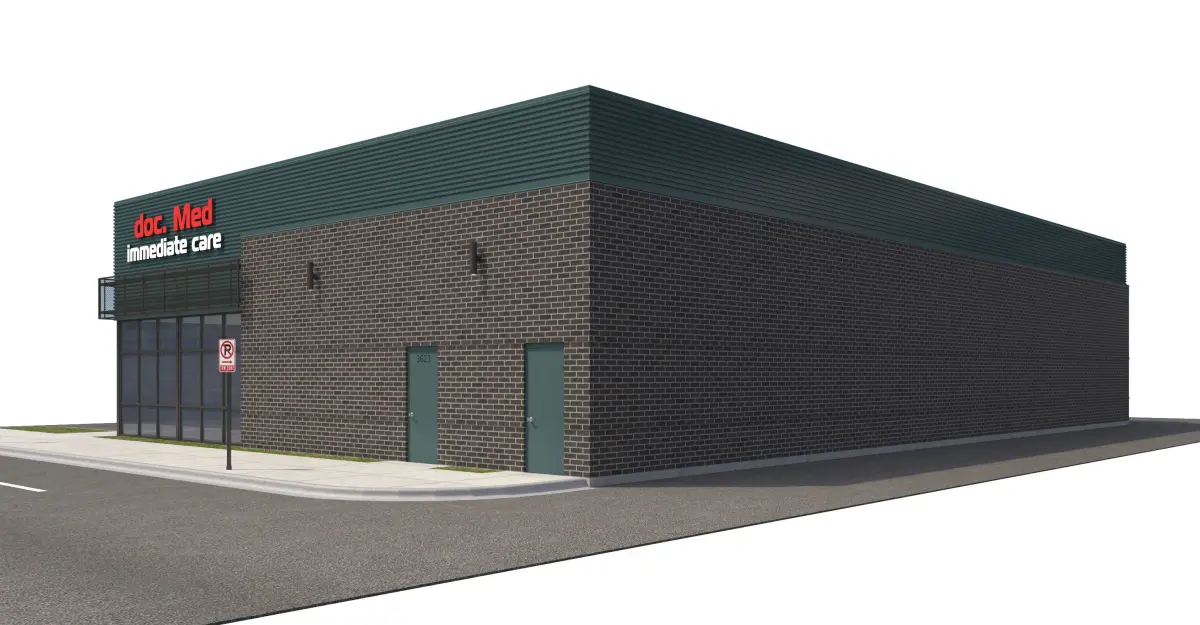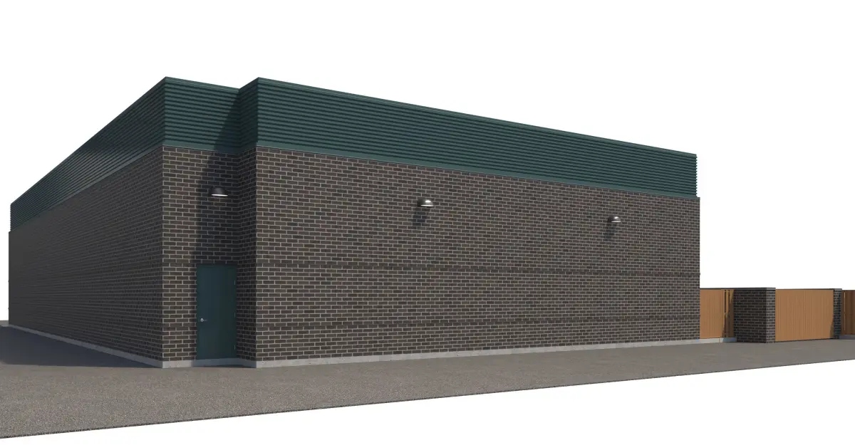 Black brick, corrugated metal panel, and perforated metal panel façade. Included with model is front sidewalk, side parking lot, side sidewalk for street connection, rear sidewalk and doors, everything shown in rendering