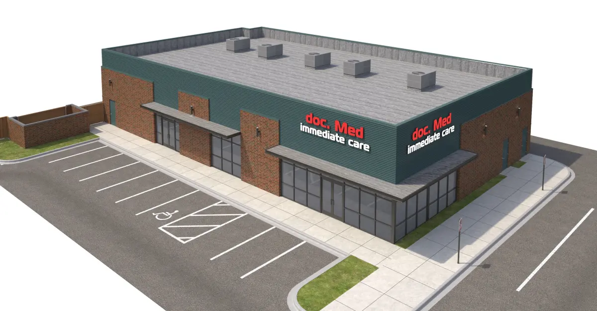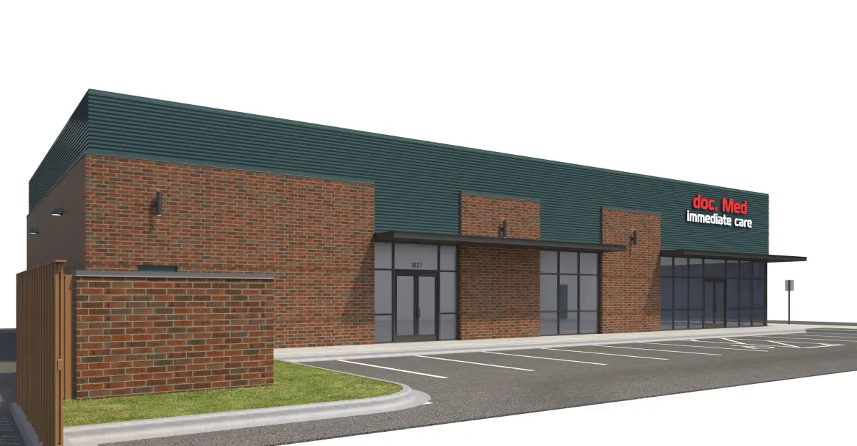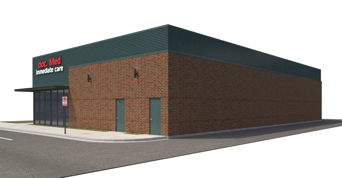 Red brick, Corrugated Metal Panel , and Canopy. Included with model is front sidewalk, side parking lot, side sidewalk for street connection, rear sidewalk and doors, everything shown in rendering