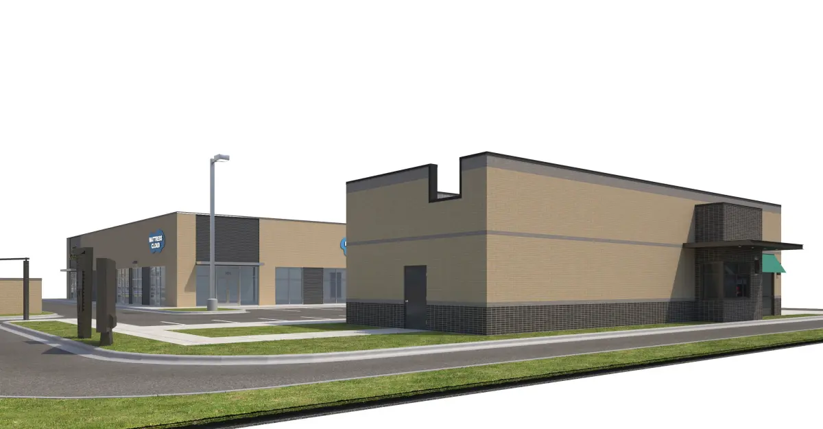 Yellow brick, Black Brick, Gray Brick, corrugated metal panel. Included with model is front sidewalk, side parking lot, side sidewalk for street connection, rear sidewalk and doors, everything shown in rendering