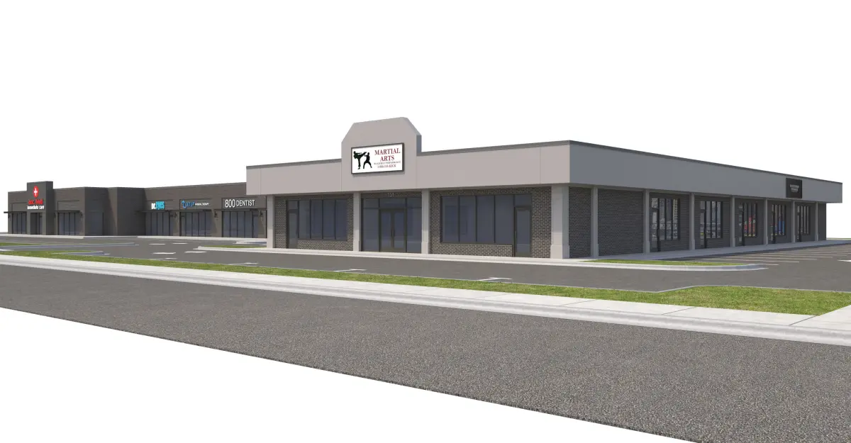 -3D model of a strip mall/outdoor Mall with tenants as shown in renderings-Interior Included, Interior Includes: Acoustical Ceiling tile and Light Fixtures, as well as interior walls and demising wall between tenants.