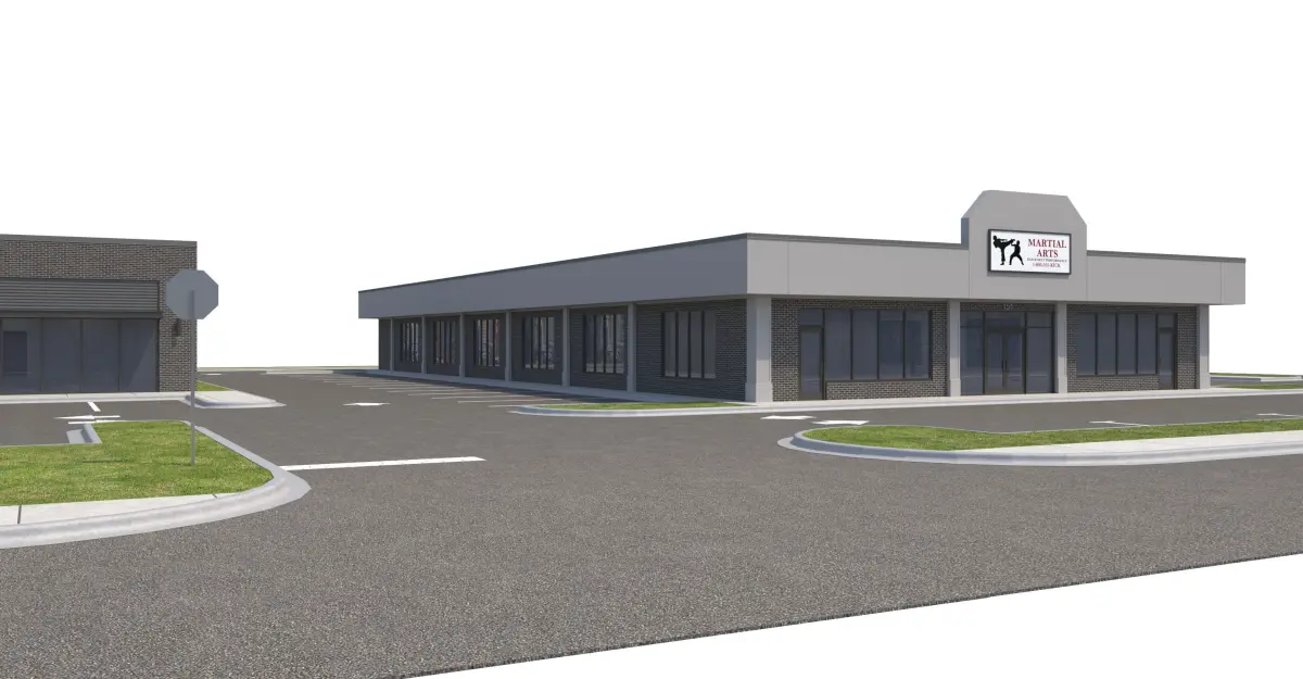 Black Brick, Eifs Walls and Piers, Corrugated Metal Infill Panels, Steel Canopies, Corrugated Panel Feature Entry. Included with model is front sidewalk, parking lot, side sidewalk for street connection, rear sidewalk and doors, everything shown in rendering